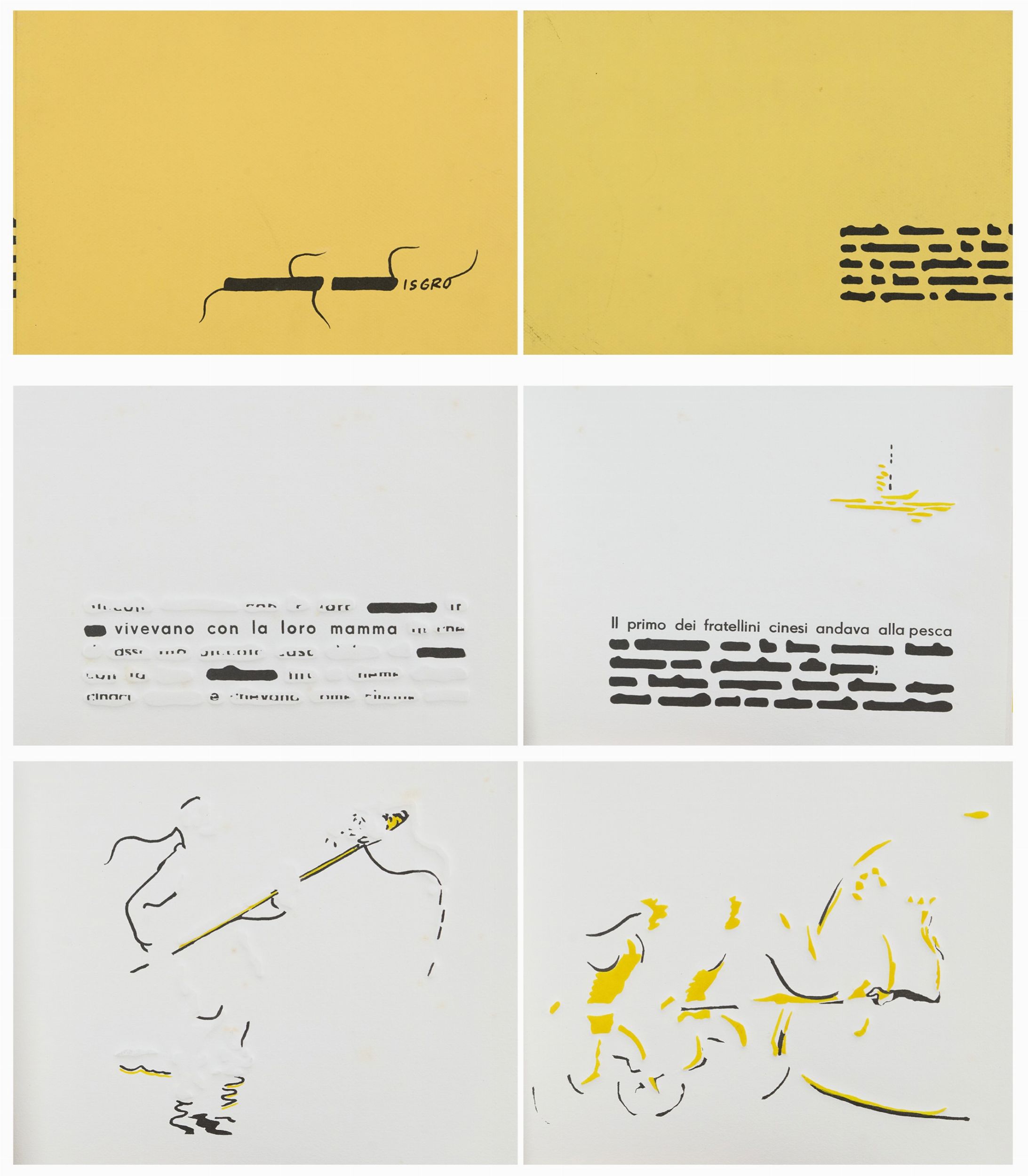 Tecnica mista, stampa a torchio litografico e calcografico, cm. 23x34 in cofanetto originale di cm. 26x35,5x6 I cinque Isgrò è opera originale realizzata da Emilio Isgrò per l’edizione 2006 dei Cento Amici del Libro. Giorgio Upiglio e Monia Pavone hanno stampato su carta Alcantara con torchio litografico il nero, con il torchio calcografico i rilievi da matrici di legno e ottone e hanno pennellato il giallo. La legatura e la custodia sono di Ruggero Rigoldi. Il testo Cinque per venticinque, scritto dallo stesso artista, fa parte dell’edizione che consta di cento esemplari “ad personam” riservati ai Soci e trenta numerati da I a XXX. Il colophon di ogni esemplare è stato firmato da Emilio Isgrò il 19 marzo 2007 in Milano.