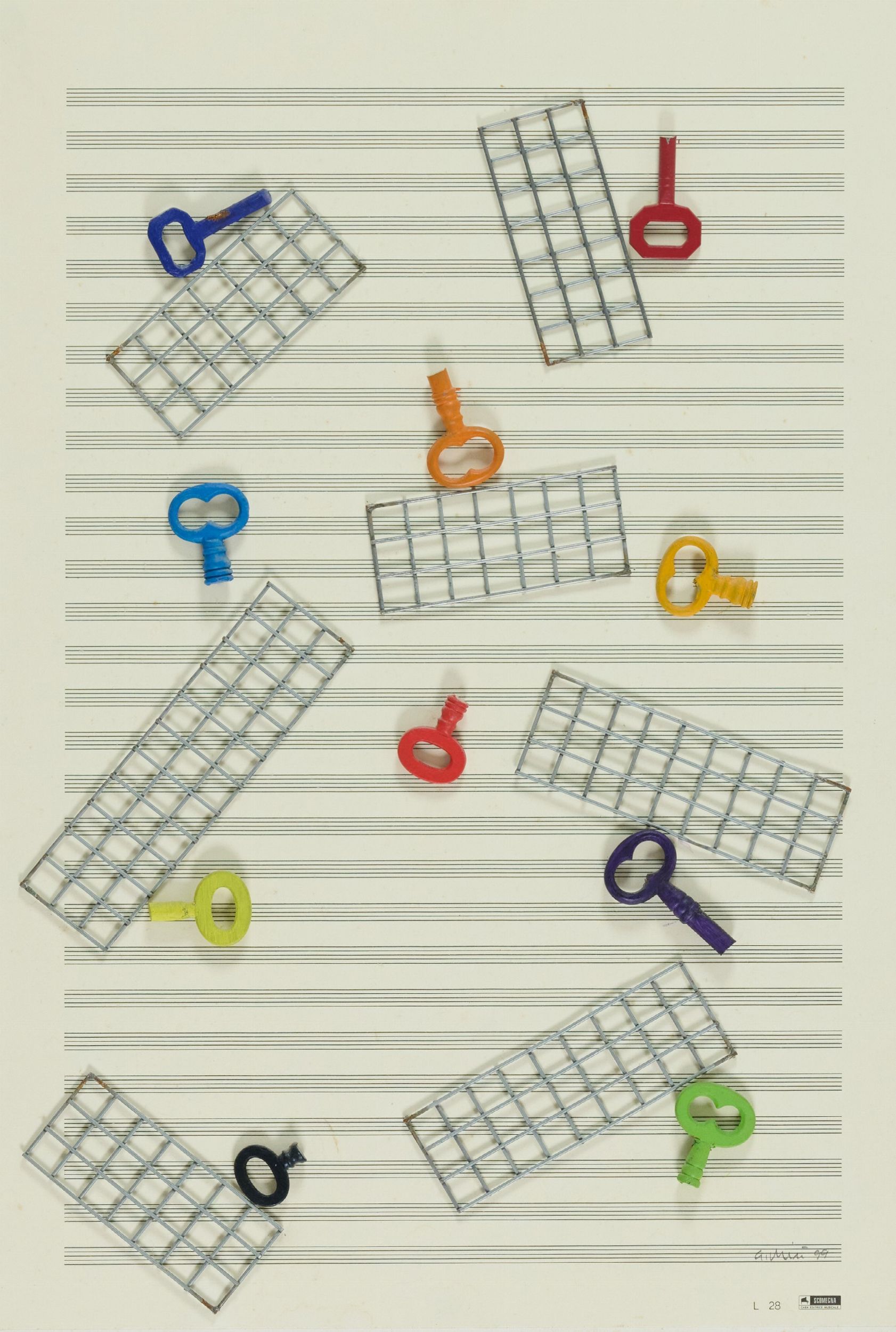 Accomulazione di oggetti su spartito musicale applicato su cartoncino applicato tavola, cm. 50x35