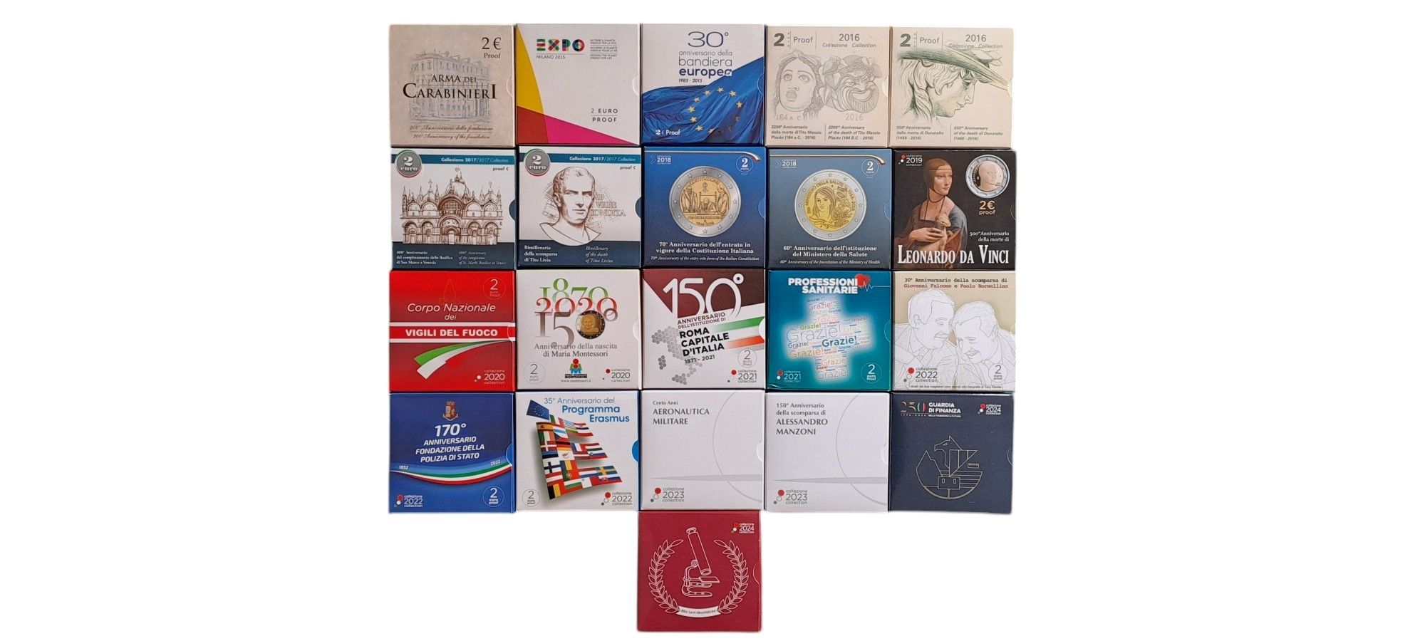 Italia 2014 - 2024 - Lotto di 21 monete da 2 Euro proof in astuccio.