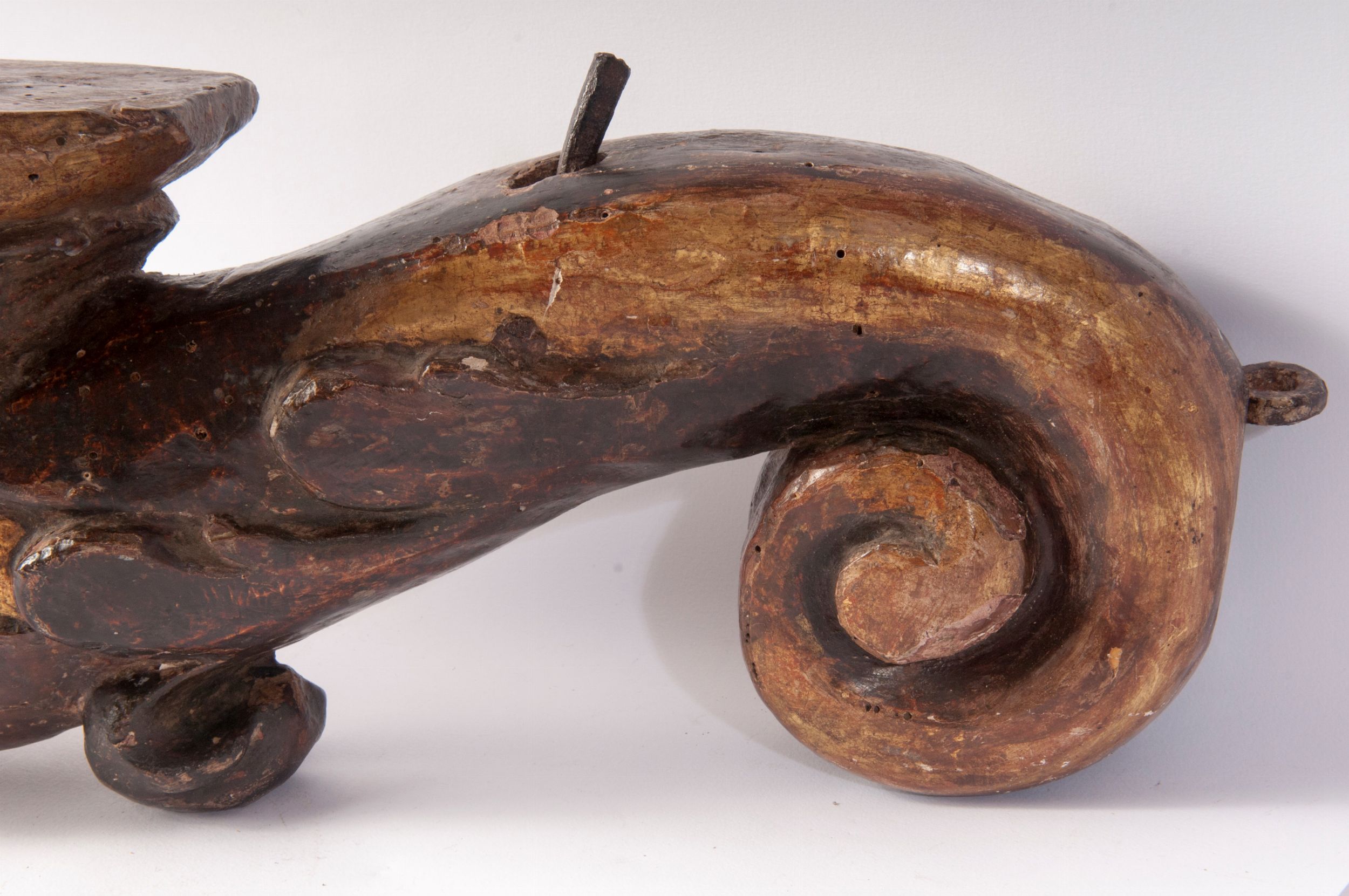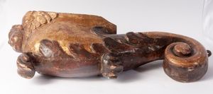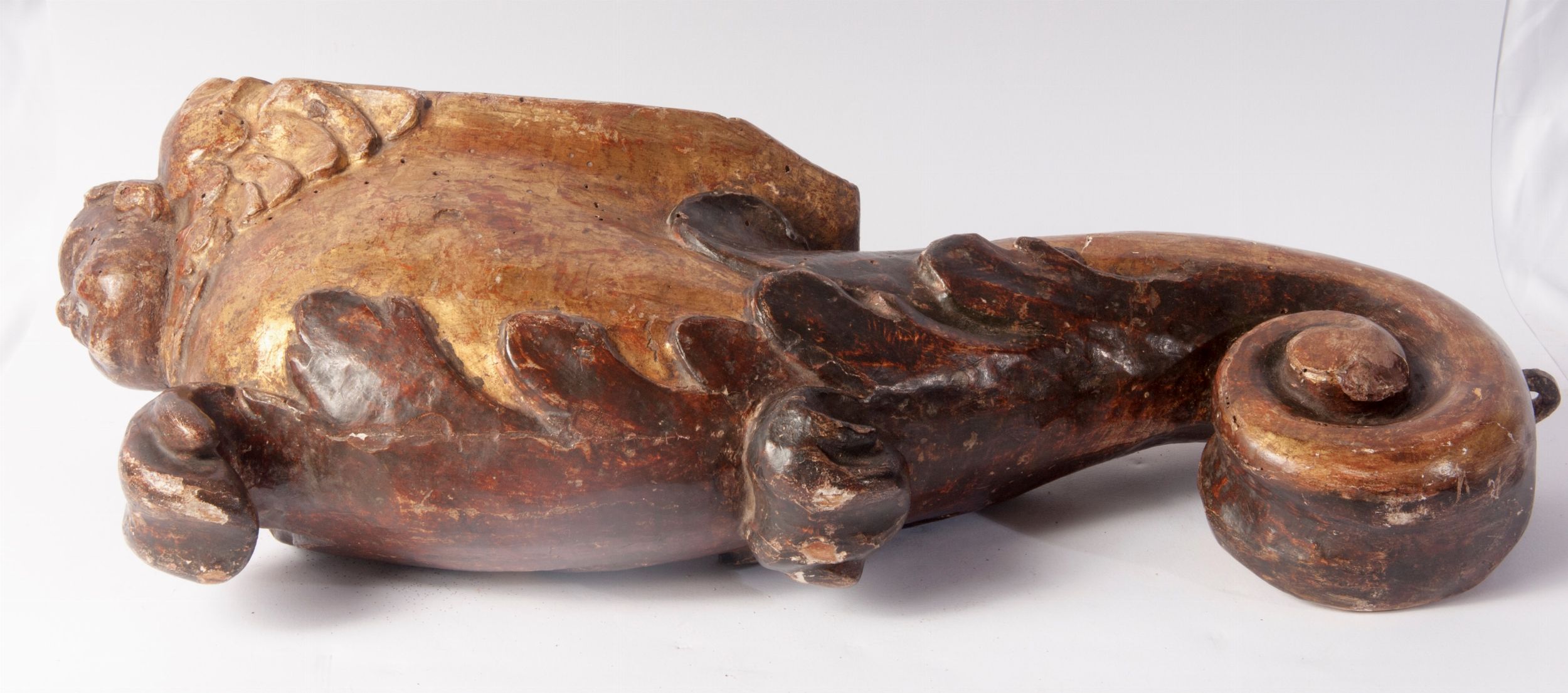 fine XVI inizio XVII secolo in legno dorato, scolpito a testa di angelo e motivi vegetali. Stato di conservazione: buono,  mancanze alla doratura.