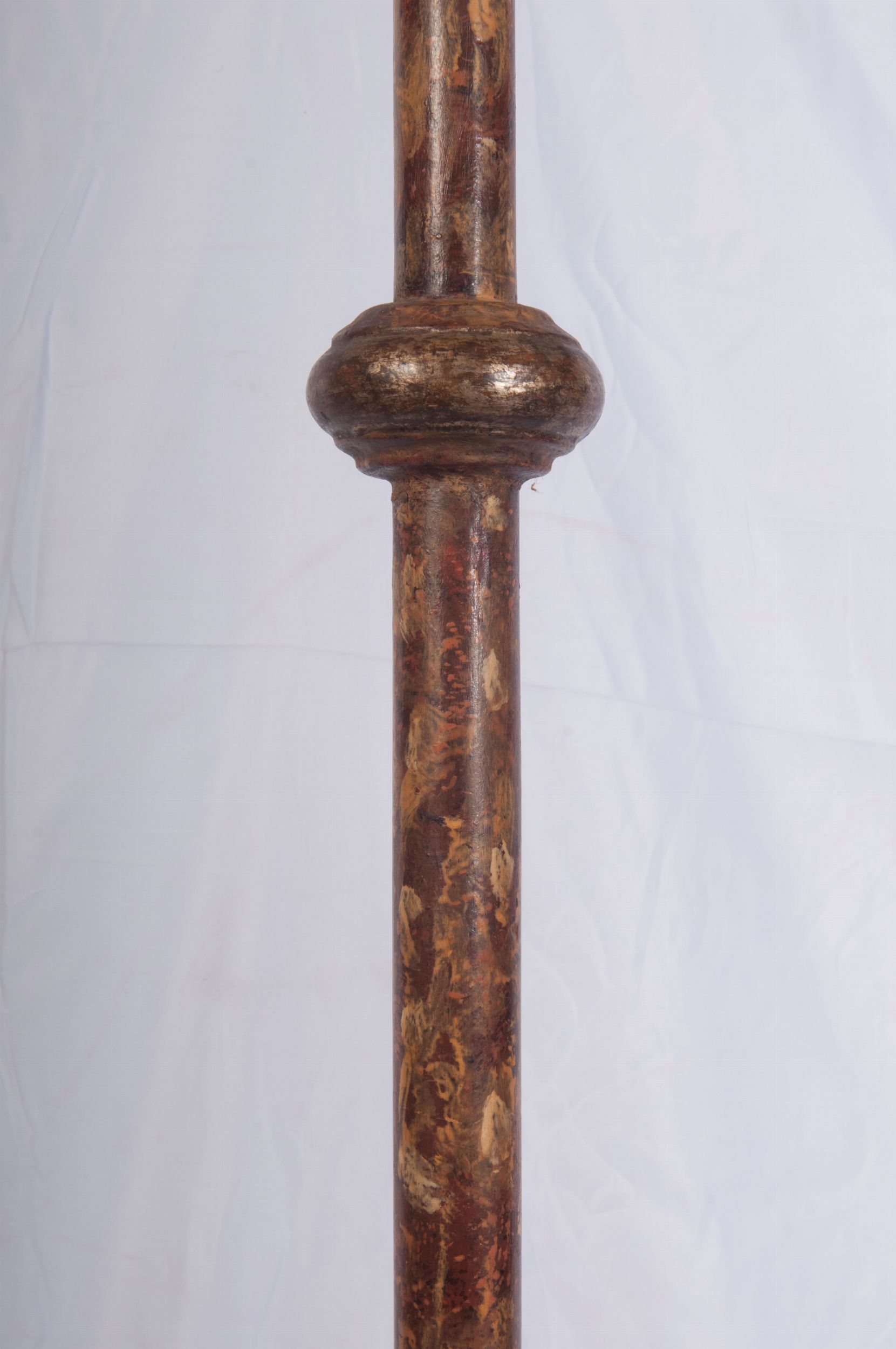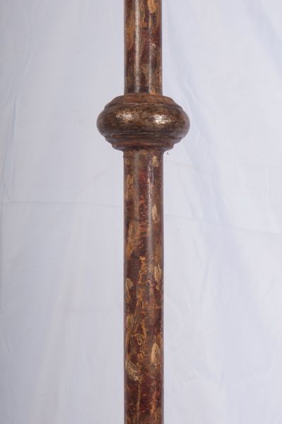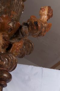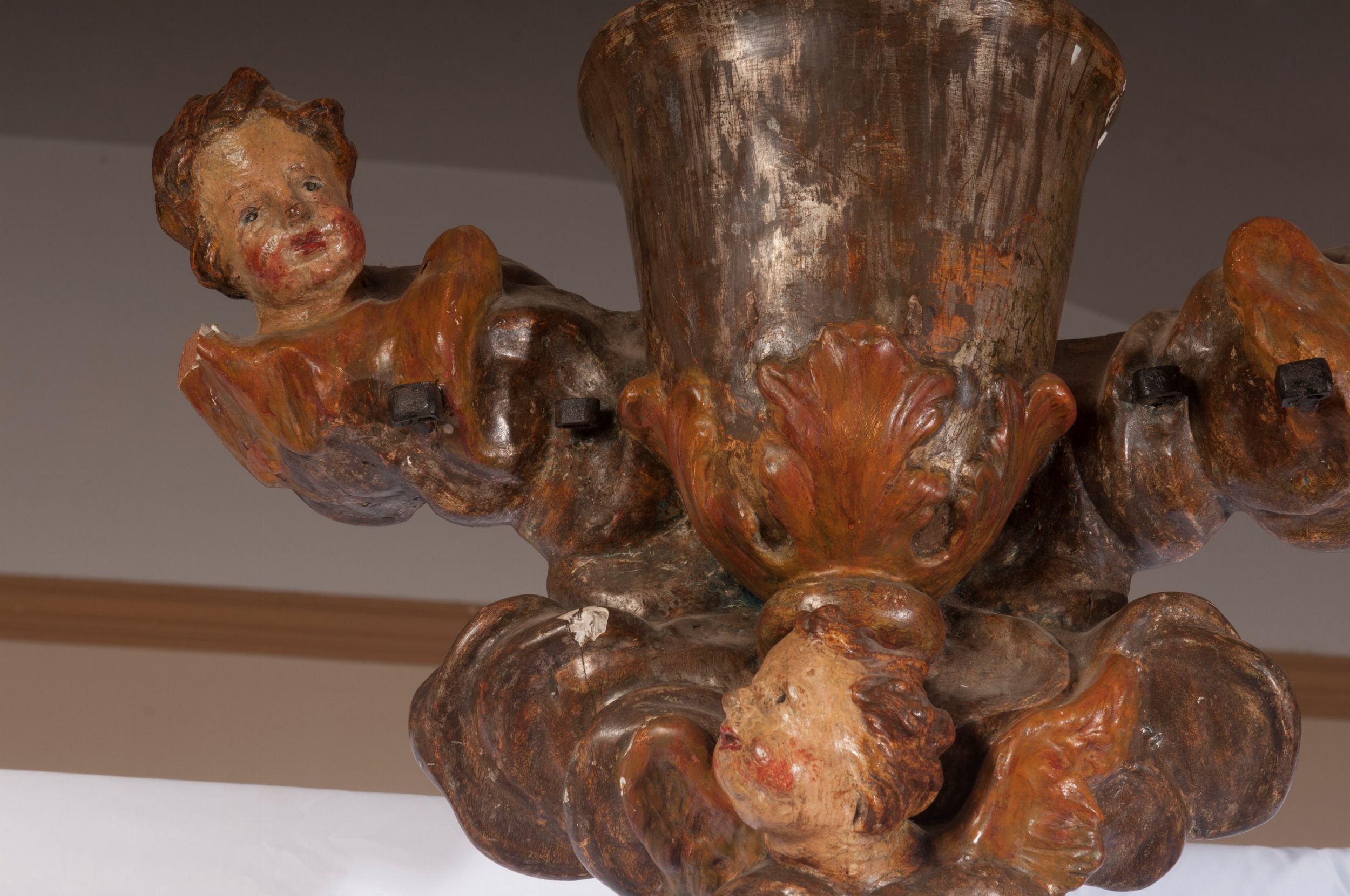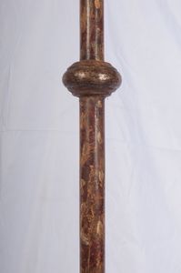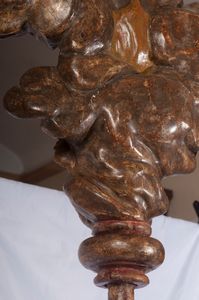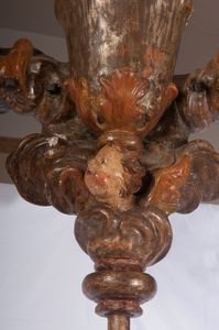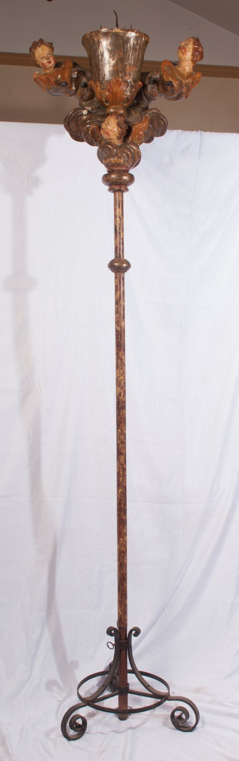 230 X 60 x 20 cm XVIII secolo dorato ed argentato. Si compone da tre teste di angelo che uscendo da un copro nuvoloso sorreggono una campana centrale argentata che fa da base per i ceri. Parti scolpite ed incise. Asta portante che si ancora su base in ferro a tre piedi a volute. Stato di conservazione: discreto, con laccature ed argentature in parte mancanti. Base non pertinente