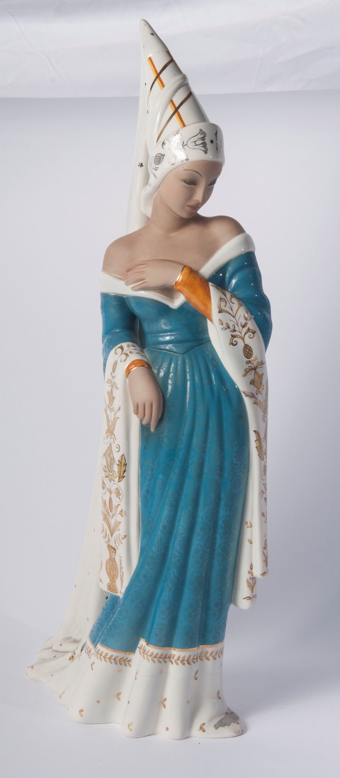 62 X 28 x 12 cm anni '40 scultura a tutto tondo in ceramica policroma con formatura a colaggio. Firma della manifattura, titolo, numero di serie e monogramma del decoratore ( Emma Pellegrini?) in nero sotto smalto alla base. Stato di conservazione: molto buono.