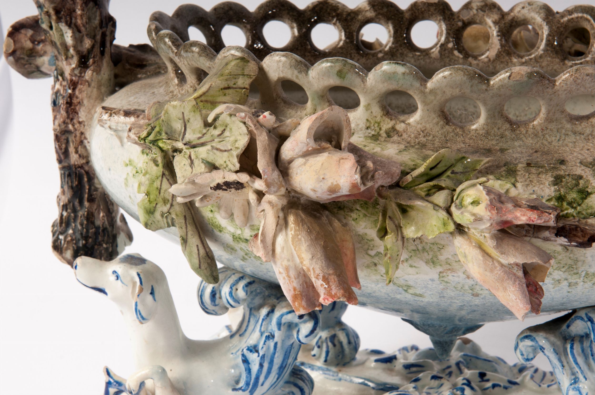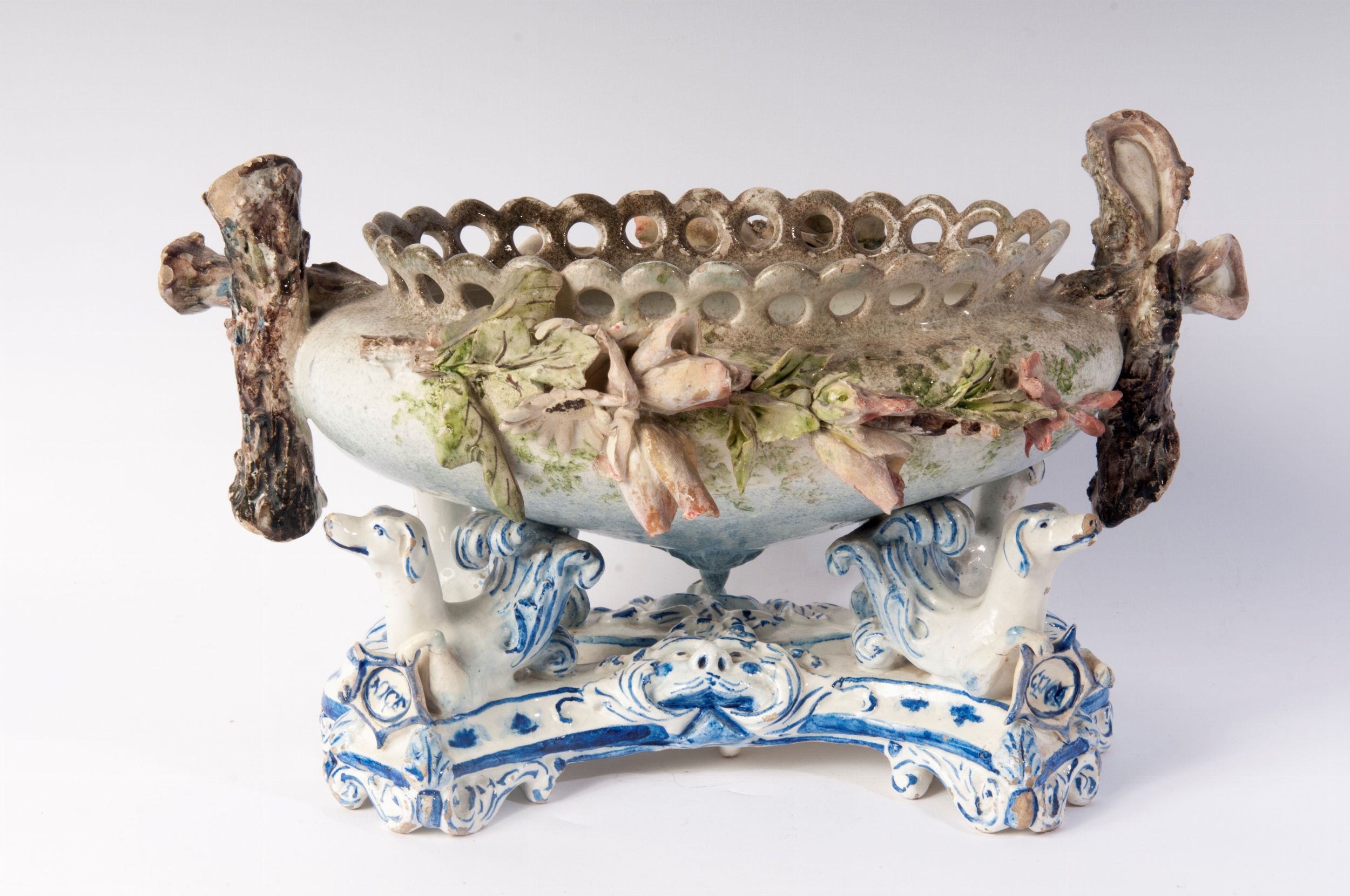 24 x 42 x 26 cm inizi XX secolo di forma ovale con canestro centrale poggiante su quattro animali fantastici. Vaso con decoro floreale a barbotina con anse a tronco. Alla base tra le zampe degli animali entro scudetti circolari nomi di città liguri. Manifattura ligure probabilmente savonese Stato di conservazione: mancanze.