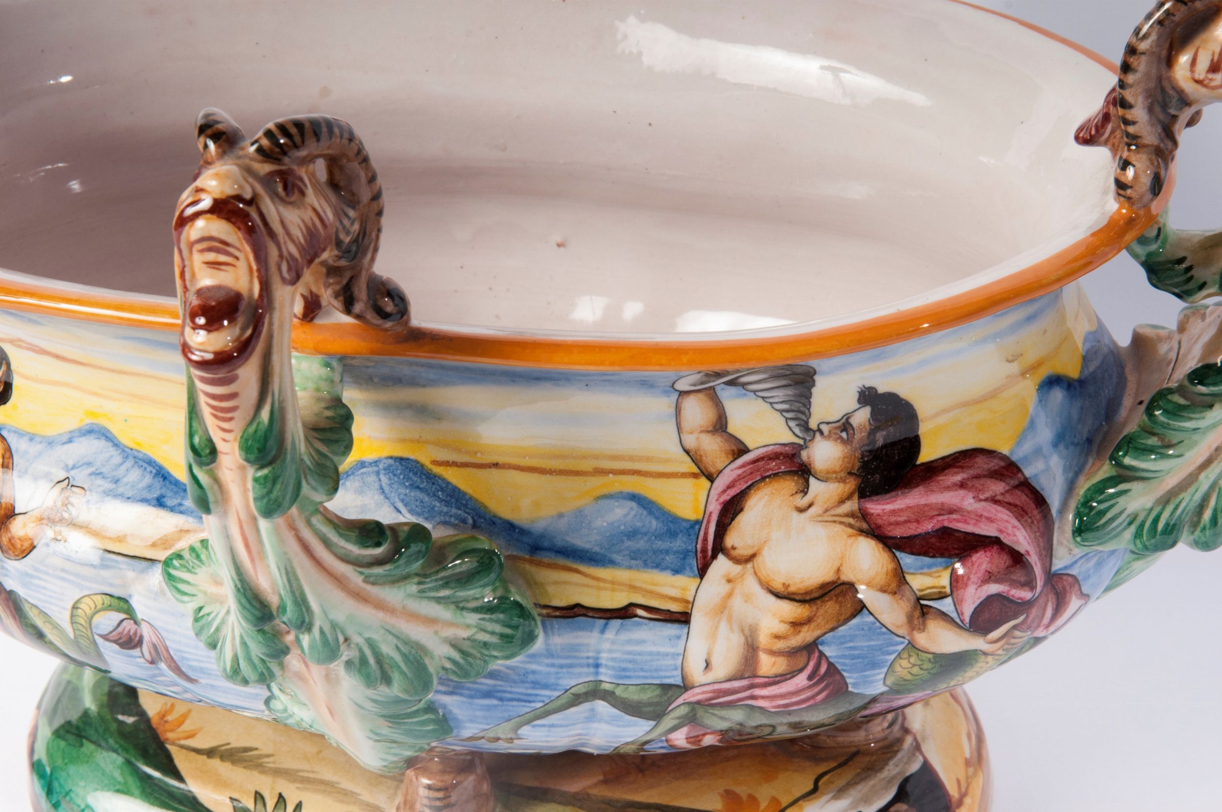 23 x 40 x 26 cm anni '20 foggiatura a stampo, di forma ovale con quattro teste di animali fantastici lungo il bordo con appoggio zoomorfo su ripiano ovale. Decoro a tutto tondo con scene di animali fantastici dal volto umano entro paesaggio di montagne e mare. Stato di conservazione: molto buono