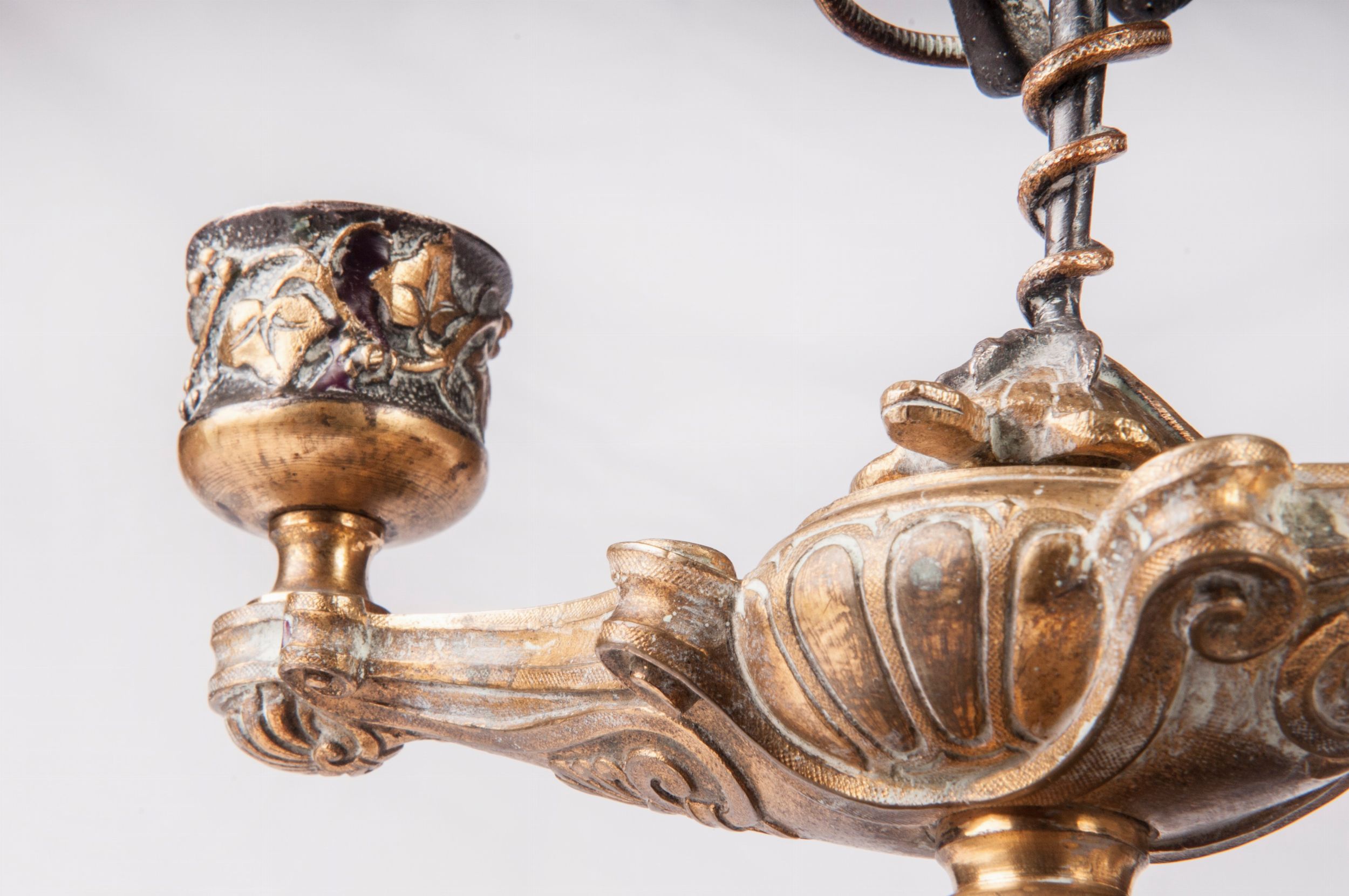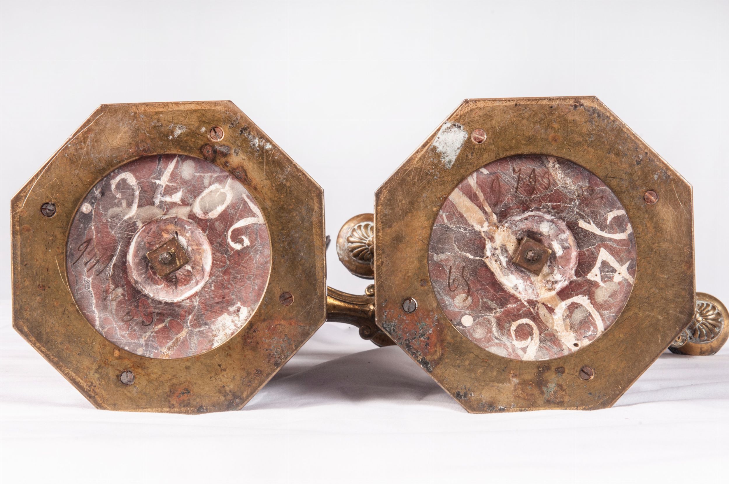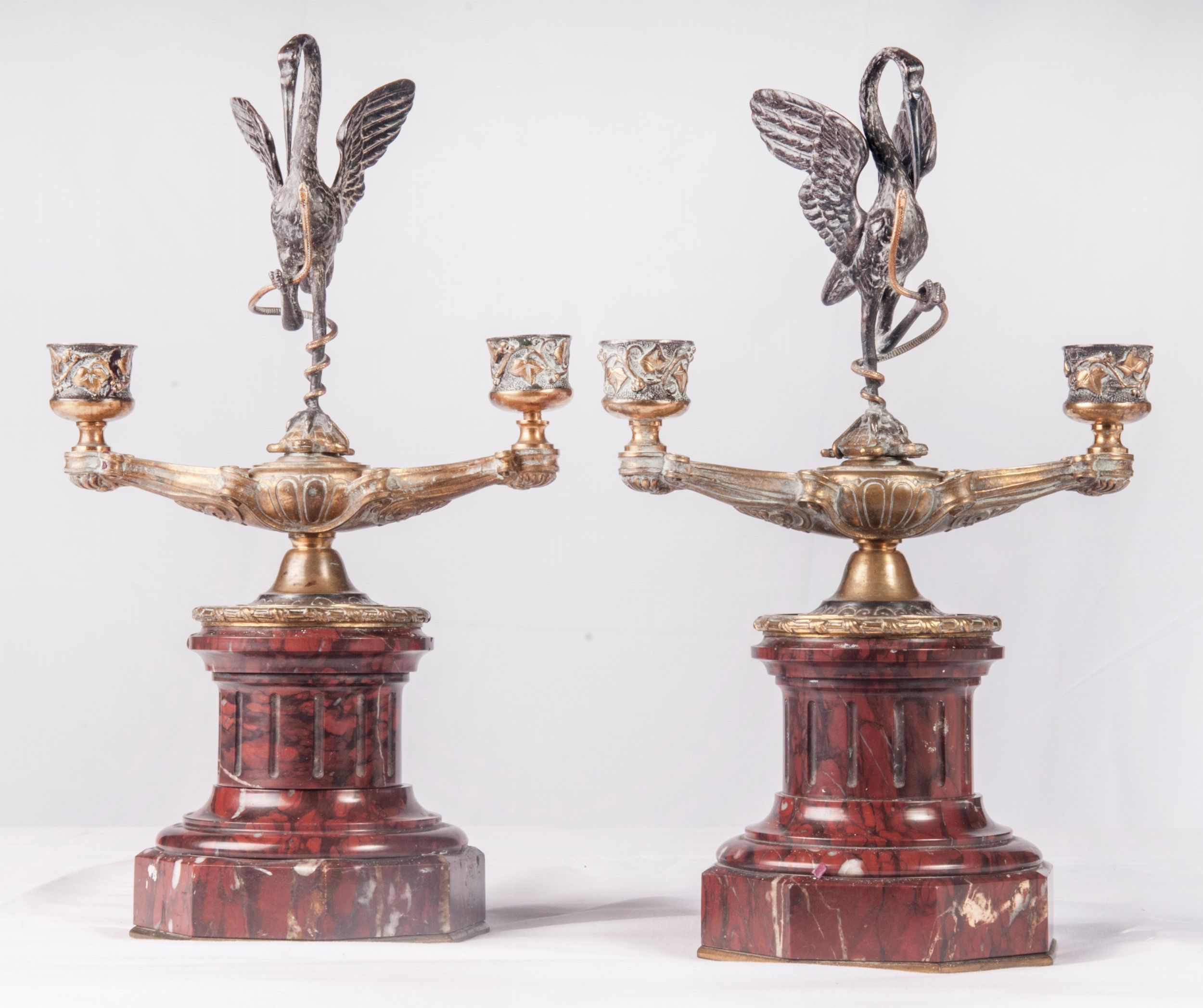 32 x 29 x 12 cm Francia ,seconda metà XIX secolo in bronzo. Piedistallo in breccia rossa delle Alpi a forma di torcio di colonna Corpo del candeliere a lucerna, sormontata da cicogna poggiante su tartaruga. Parti a rilievo con decoro floreale. Stato di conservazione: molto buono