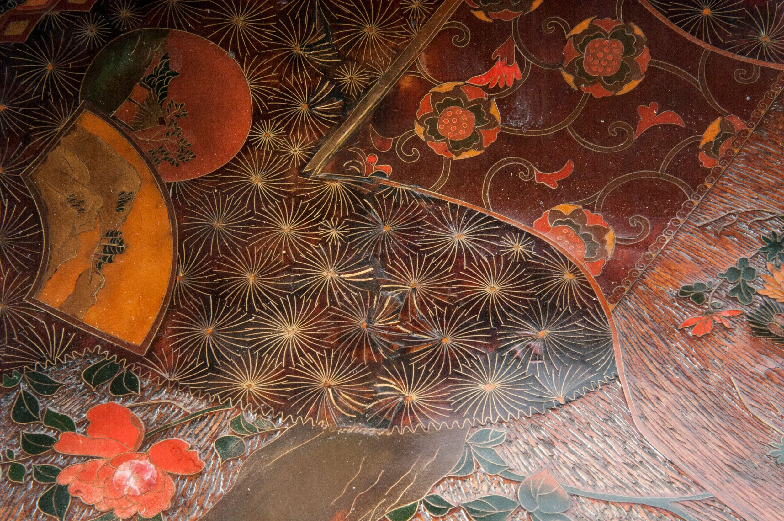 diametro 46 x 6,5 cm Giappone, fine XIX inizi XX secolo policroma a tutto fondo con scene di genere ad alberi ed uccellini tratti dal repertorio dell'estremo oriente. Decorazione a rilievo nello spessore dello smalto. Al retro appoggio ad anello su fondo ribassato in monocromia bianca con decoro floreale in blu cobalto. Stato di conservazione: cadute mateliche di colore
