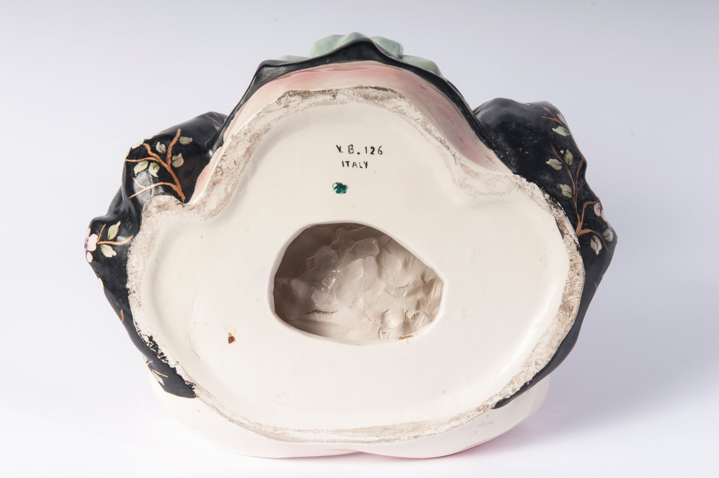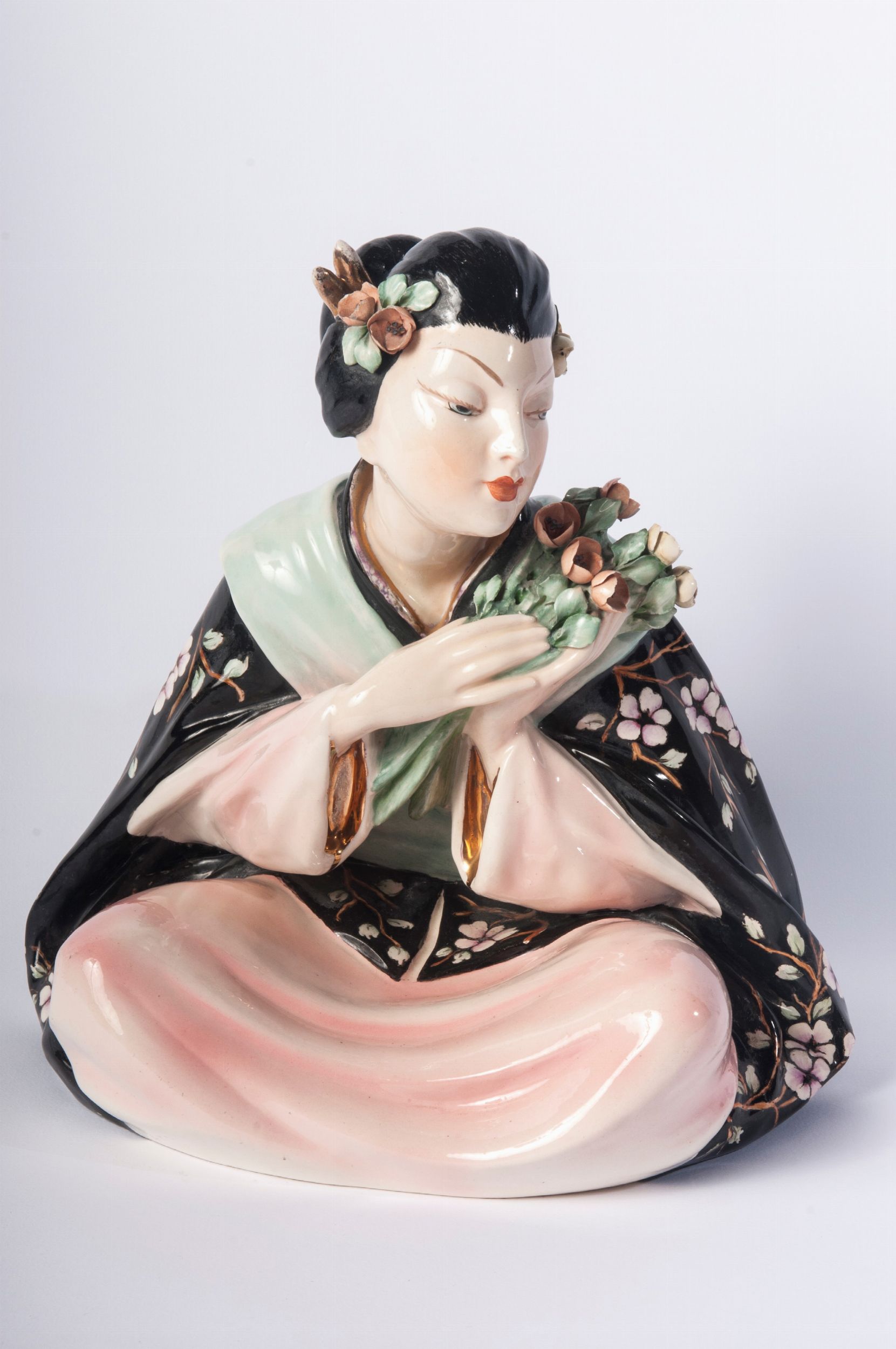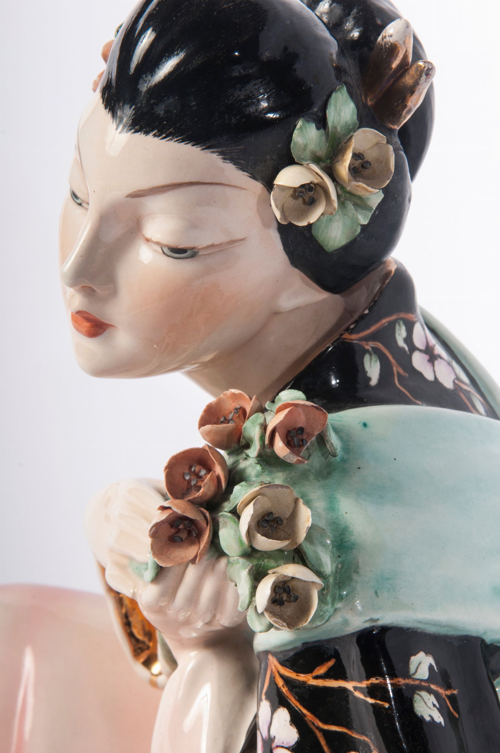 30 x 26 x 20 cm fine anni'30 scultura a tutto tondo in ceramica policroma con formatura a colaggio. Firma dell'autore incussa nella pasta al retro, firma della manifattura in nero sotto smalto alla base. Stato di conservazione: buono, usure alla doratura del ferma capelli e lieve mancanza allo smalto nella parte posteriore del vestito.