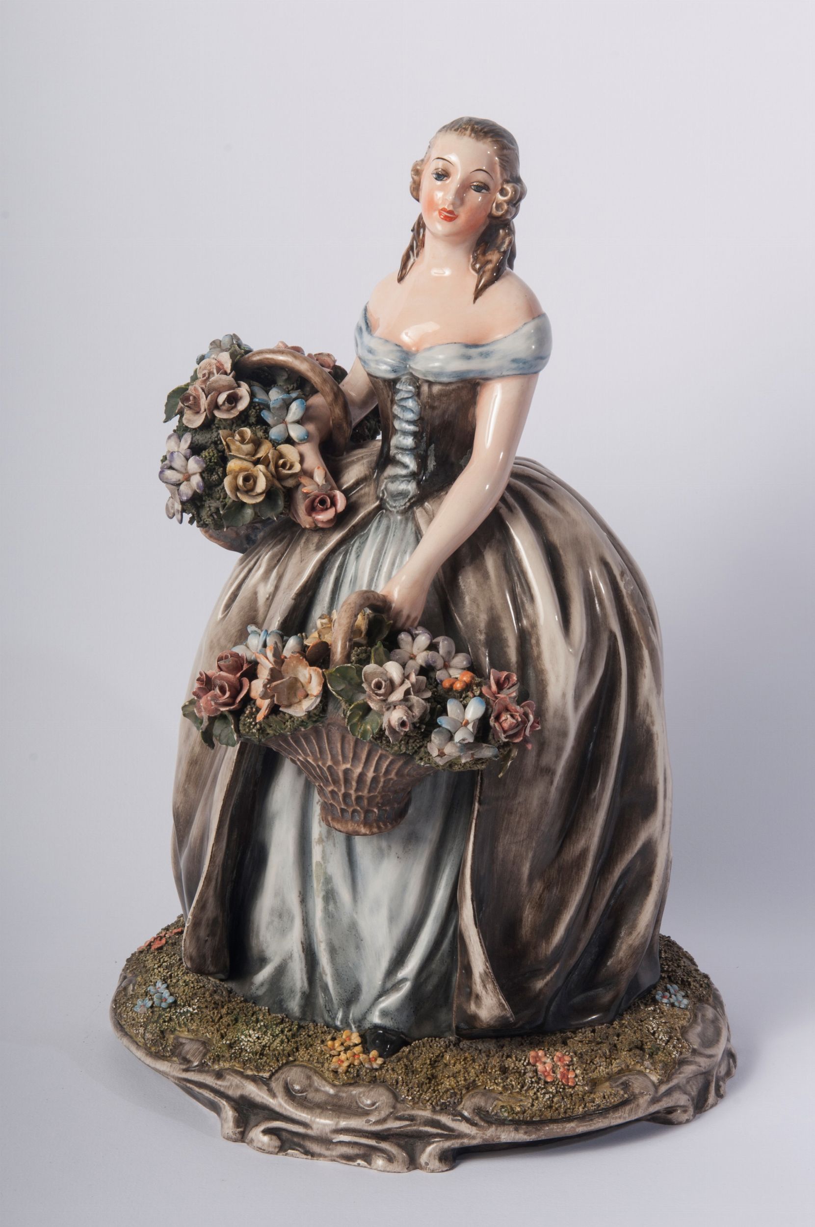 39 x 23 x 23 cm seconda metà XX secolo scultura modellata a colaggio in ceramica policroma a tutto tondo. Manifattura italiana, firma incussa nella pasta in basso al retro. Stato di conservazione: molto buono, minima mancanza di smalto al margine posteriore ed inferiore della veste.