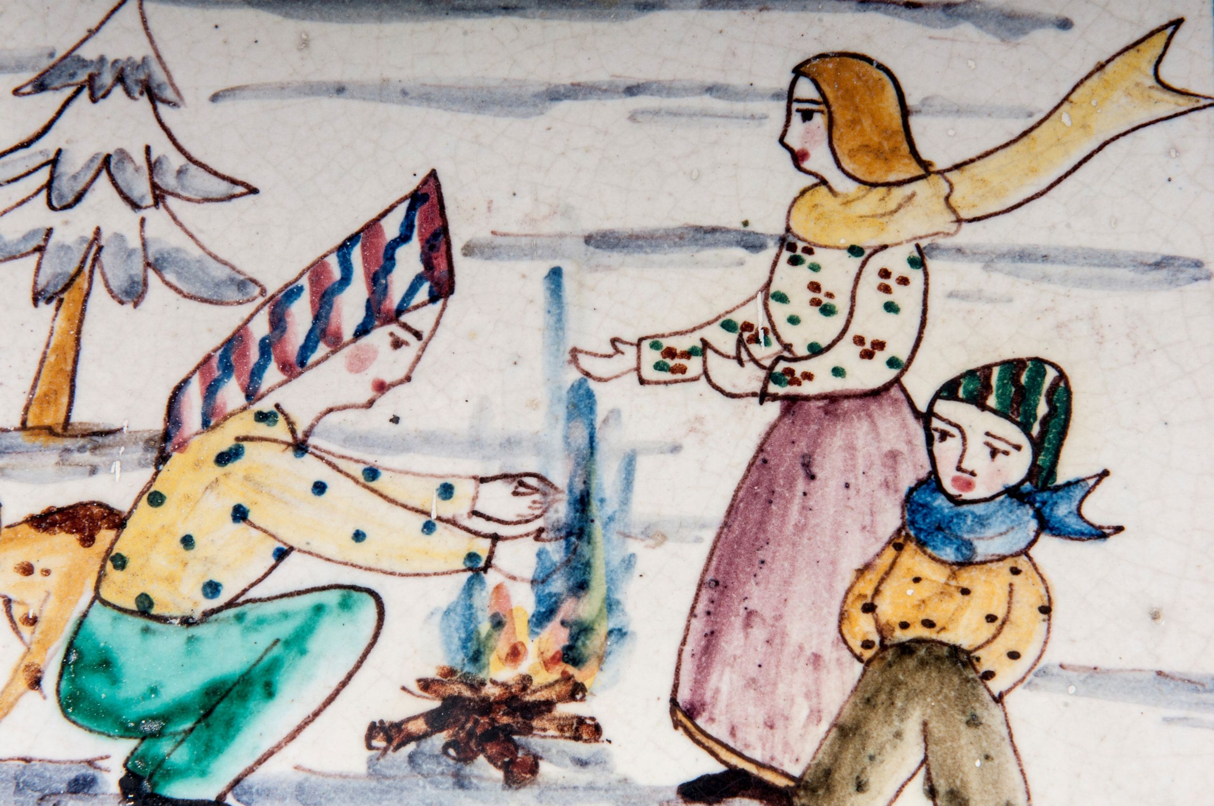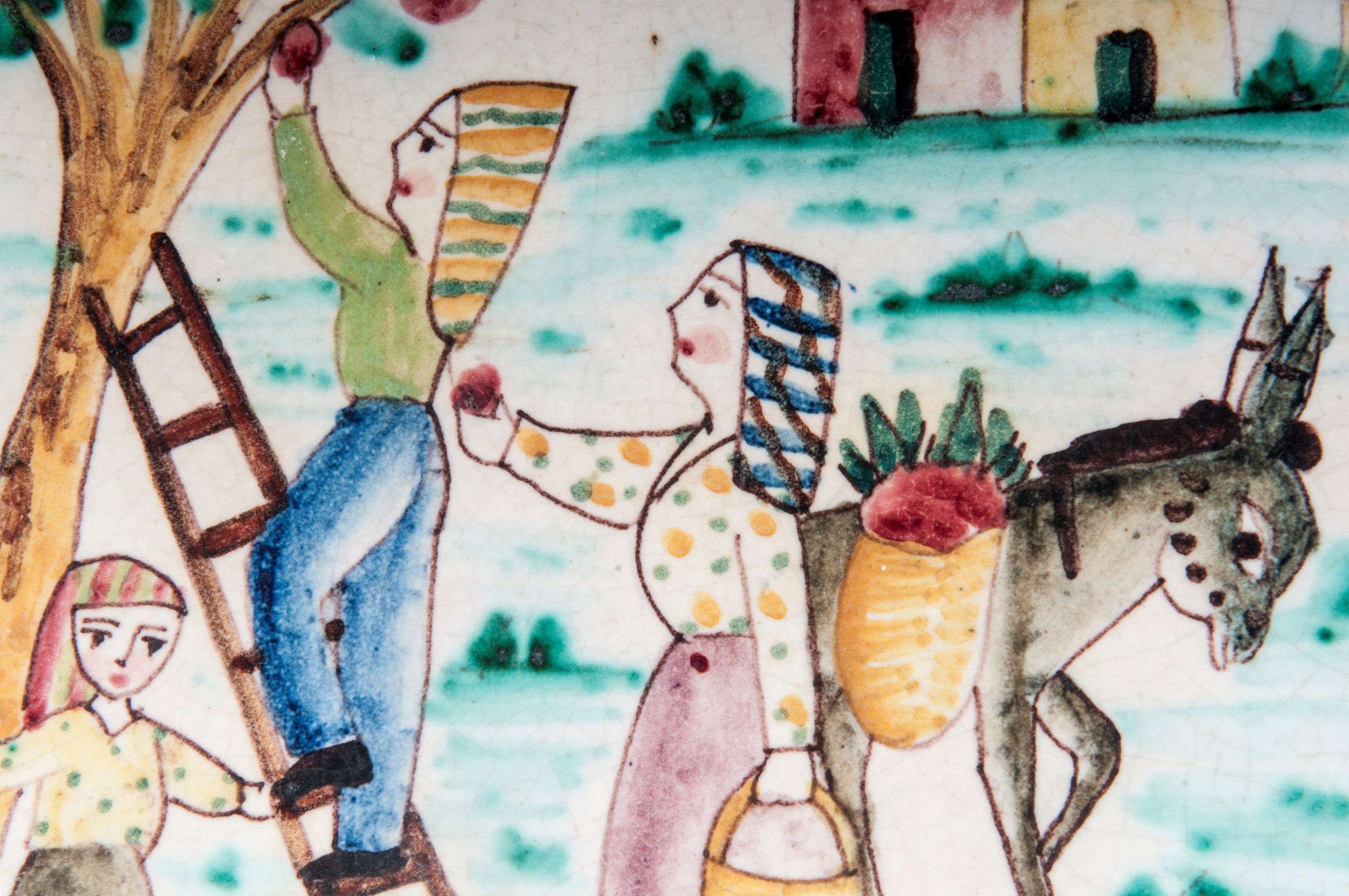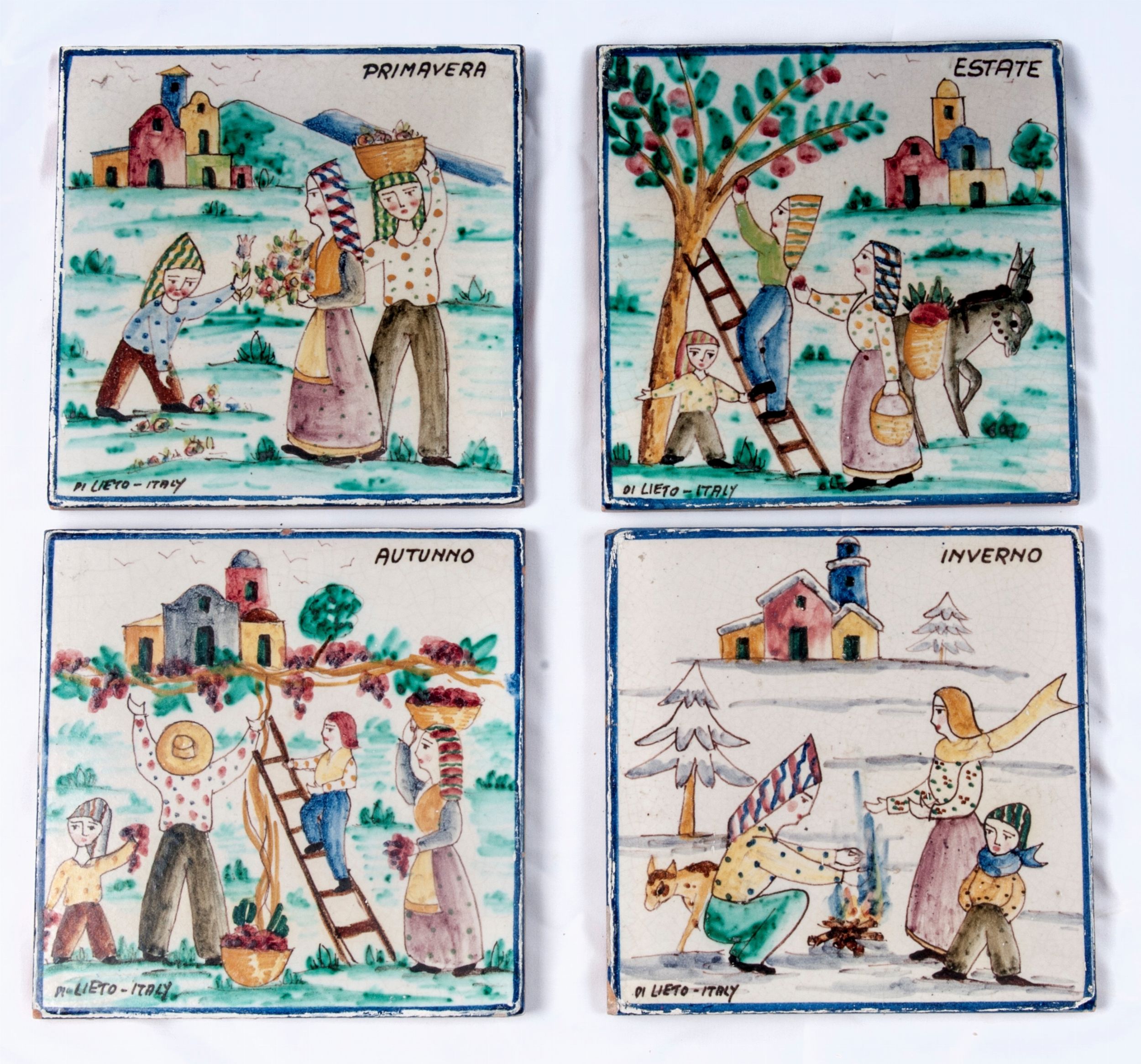 20 X 20 cm anni'50 lotto di mattonelle in ceramica policroma con le allegorie delle quattro stagioni, foggiatura a stampo. Manifattura Mauro di Lieto Vietri , firmate sul fronte in basso a sinistra Stato di conservazione: buono , piccole mancanze allo smalto lungo il bordo