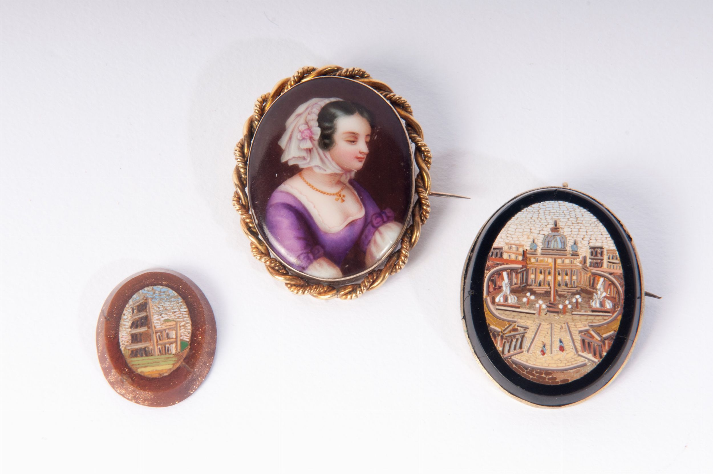 scuola romana, inizi XX secolo raffiguranti piazza S. Pietro 3,5 x 3 con castone a spilla; Colosseo slegato 2,5 x 2 cm; giovane fanciulla su porcellana con castone montato a spilla 4 x 3 cm Stato di conservazione: buono con rincollature dei due micromosaici
