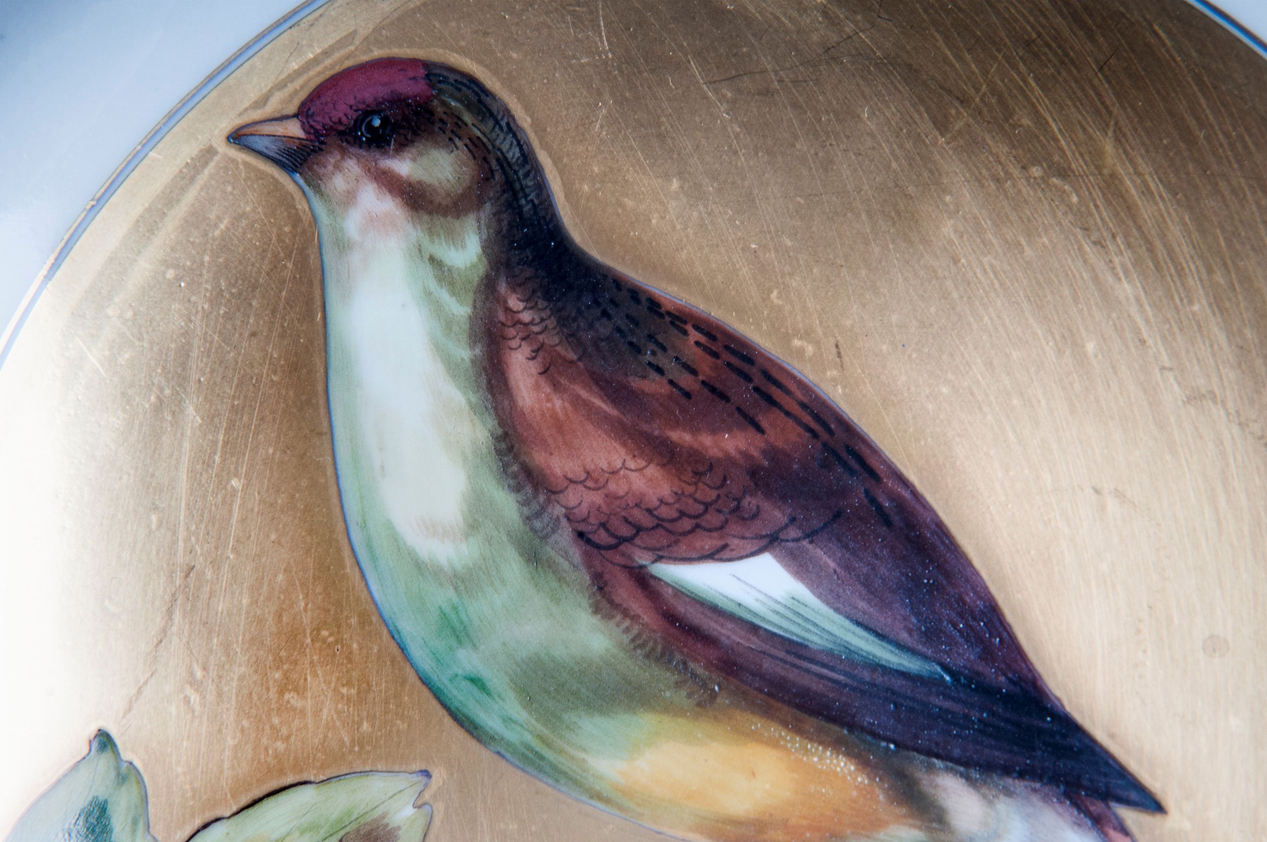 24,6 x 2,6 cm in porcellana policroma, dalla tesa dorata con orlo in oro zecchino. Fondo bianco con riproduzione di volatile entro riserva dorata. Al retro fondo ribassato con anello e segnatura della manifattura in blu sotto smalto. Manifattura di Vienna , seconda metà XIX secolo Stato di conservazione: buono, usure come da uso nel tempo.