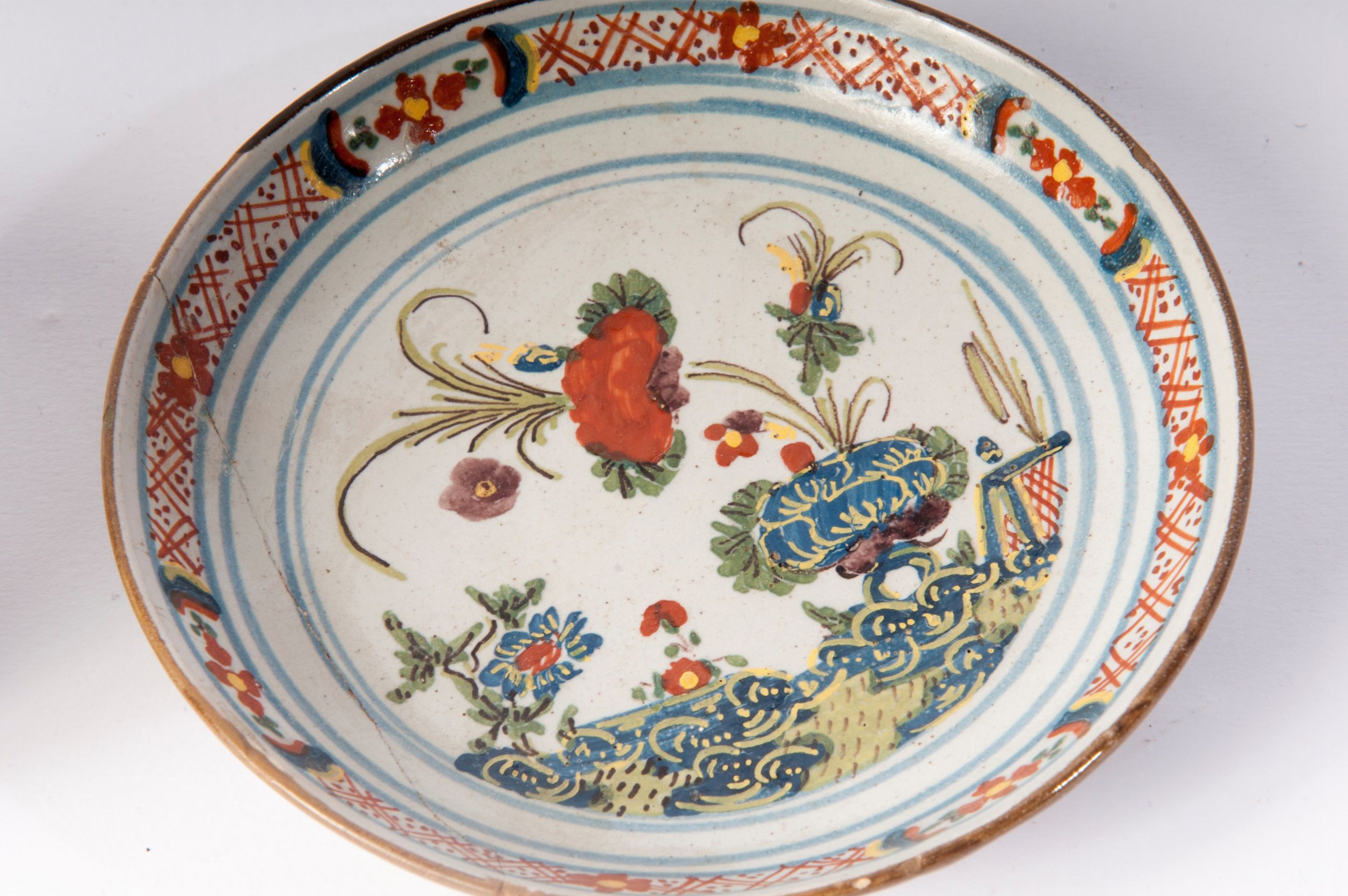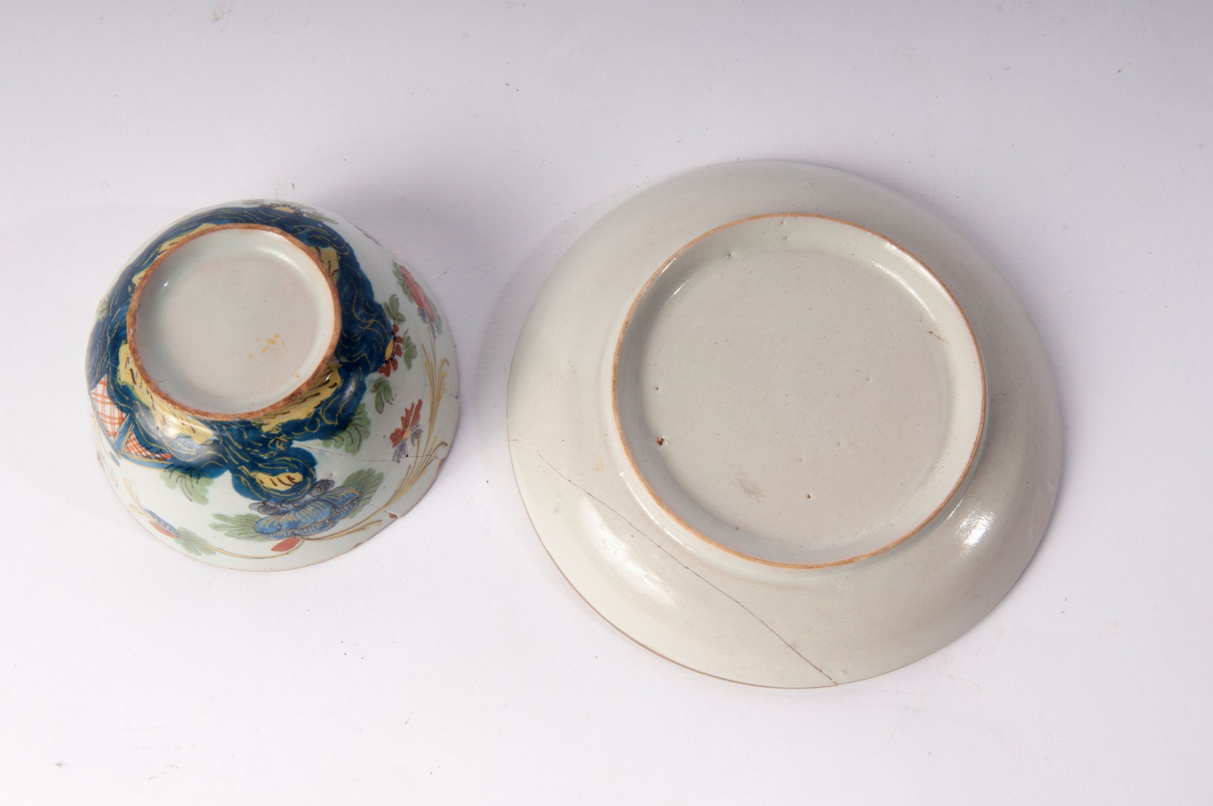 seconda metà XVIII secolo in ceramica policroma delle quali: tazza a campana con piatto en suite, decoro 'a garofano' 5,5 x 7,5 cm e 12,4 x 3 cm; tazza a litron con presa ad orecchio e piatto en suite, decorazione in monocromia a fiori verdi su fondo bianco 6 x 6 cm e 12 x 2,5 cm , manifattura Ferniani, seconda metà XVIII secolo Stato di conservazione: restauri e mancanze
