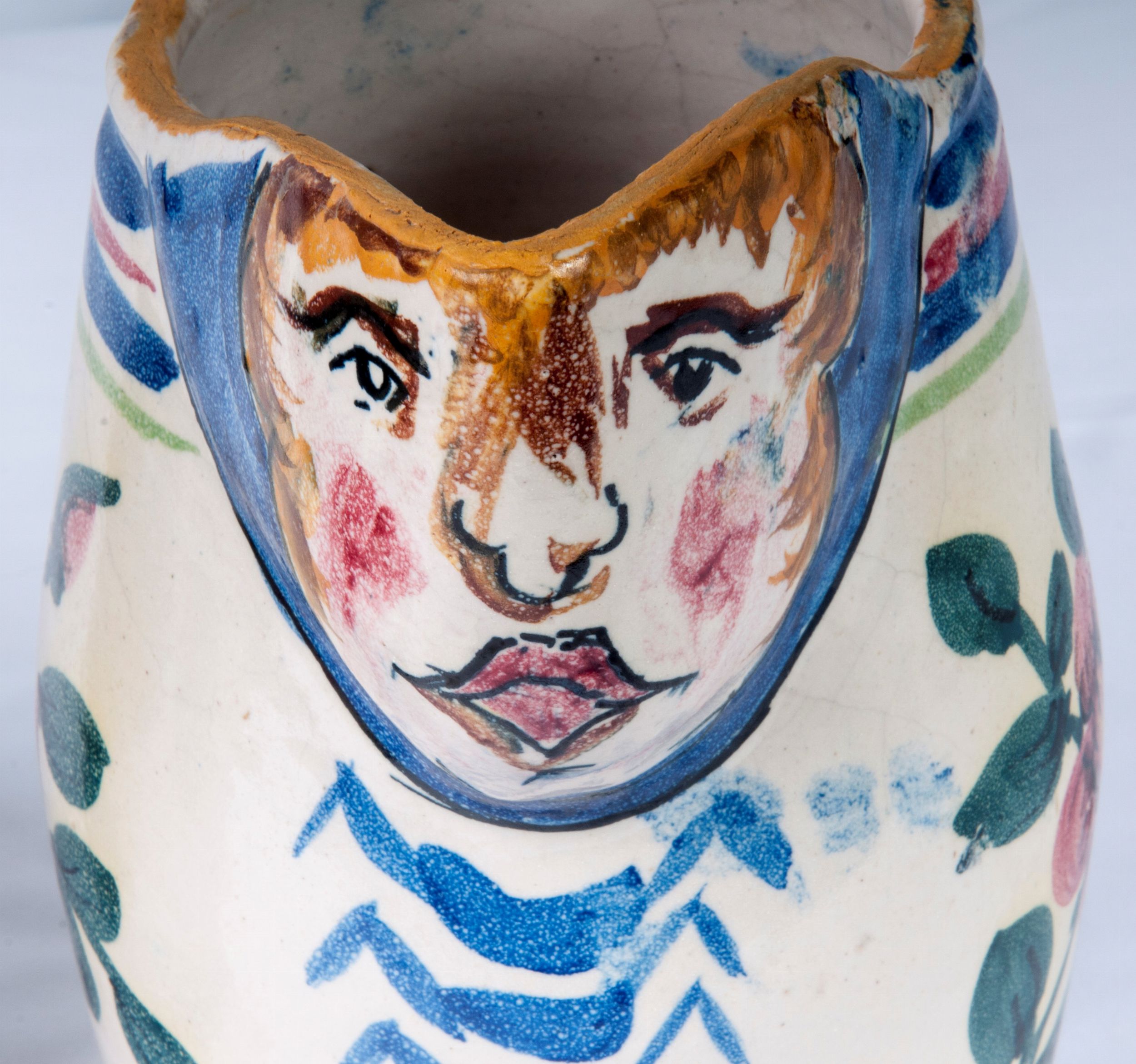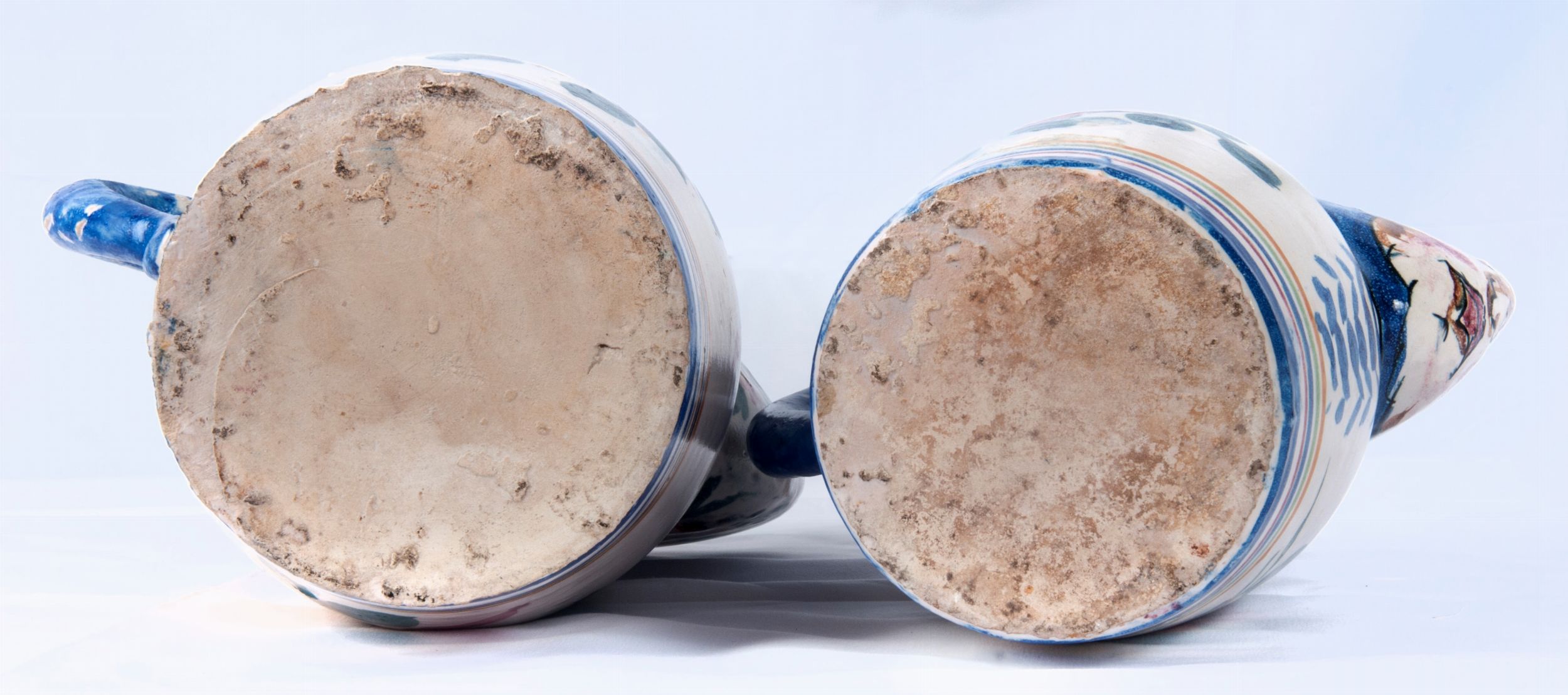 24 x 12,5 cm; 21,5 x 11 cm metà XX secolo in ceramica policroma con decoro a fiore e frutta l'uno e a fiori e testa di putto l' altro. Dal corpo leggermente a botte con presa ad orecchio. Versatoio a becco. Manifattura probabilmente vietrese. Stato di conservazione: molto buono