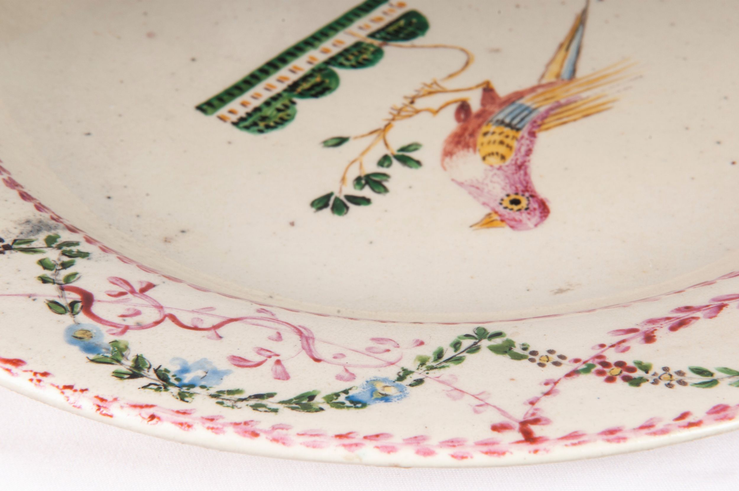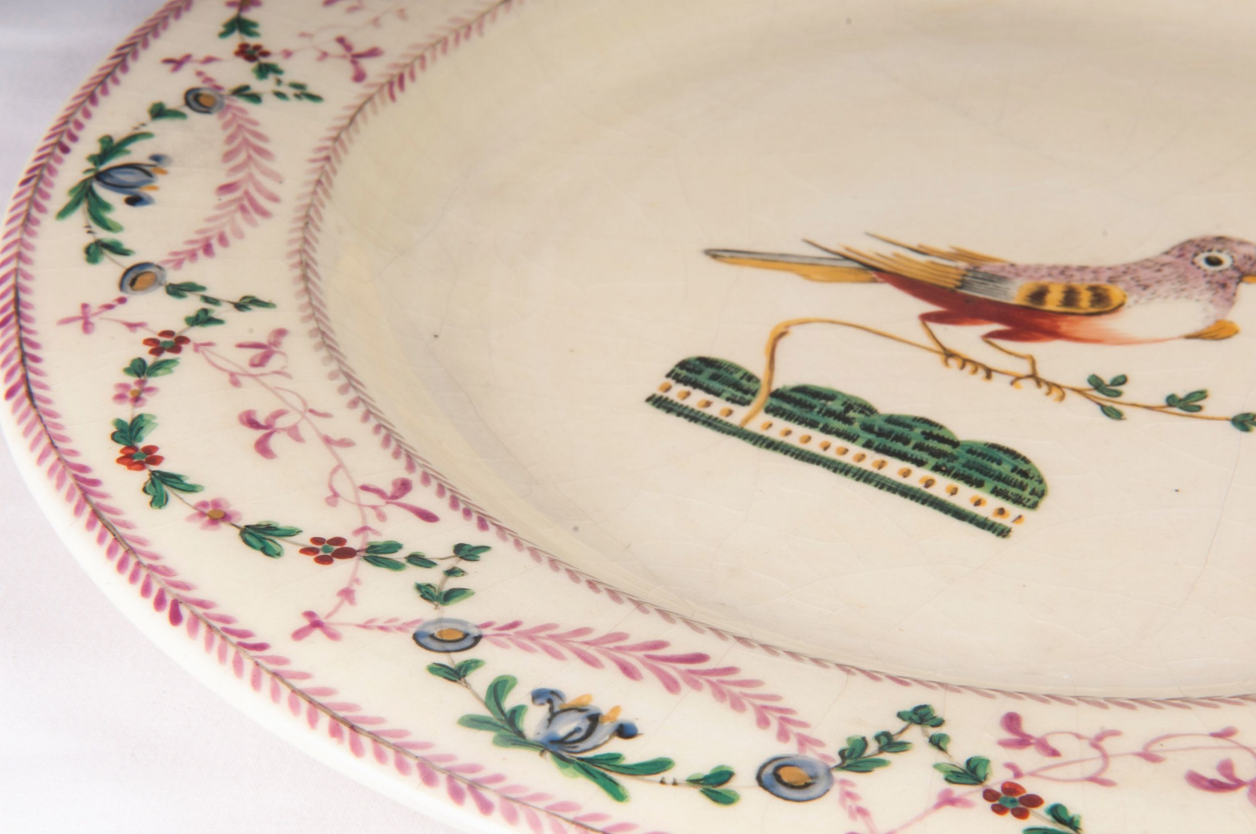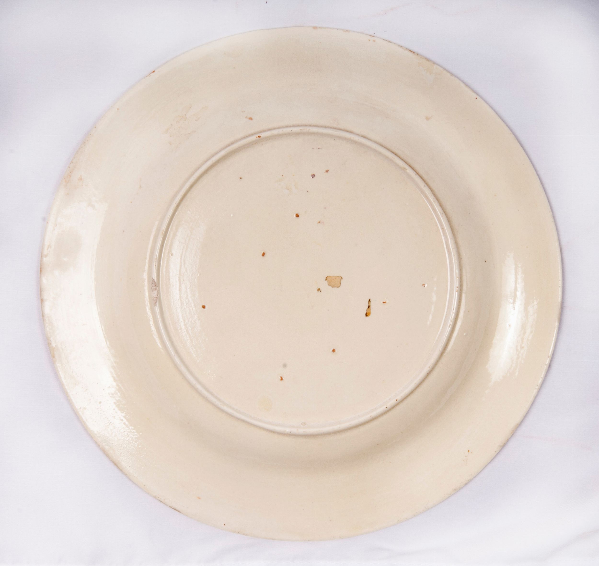diametro 26,8 x 3 cm; 23 x 2,5 cm fine XVIII inizi XIX secolo in terraglia a fondo crema con decoro floreale nella tesa ed uccellini nel cavo. Retro ad anello con fondo ribassato. Manifattura Giustiani, Napoli con timbro incusso nella pasta al retro. Stato di conservazione: parti ricostituite e restaurate