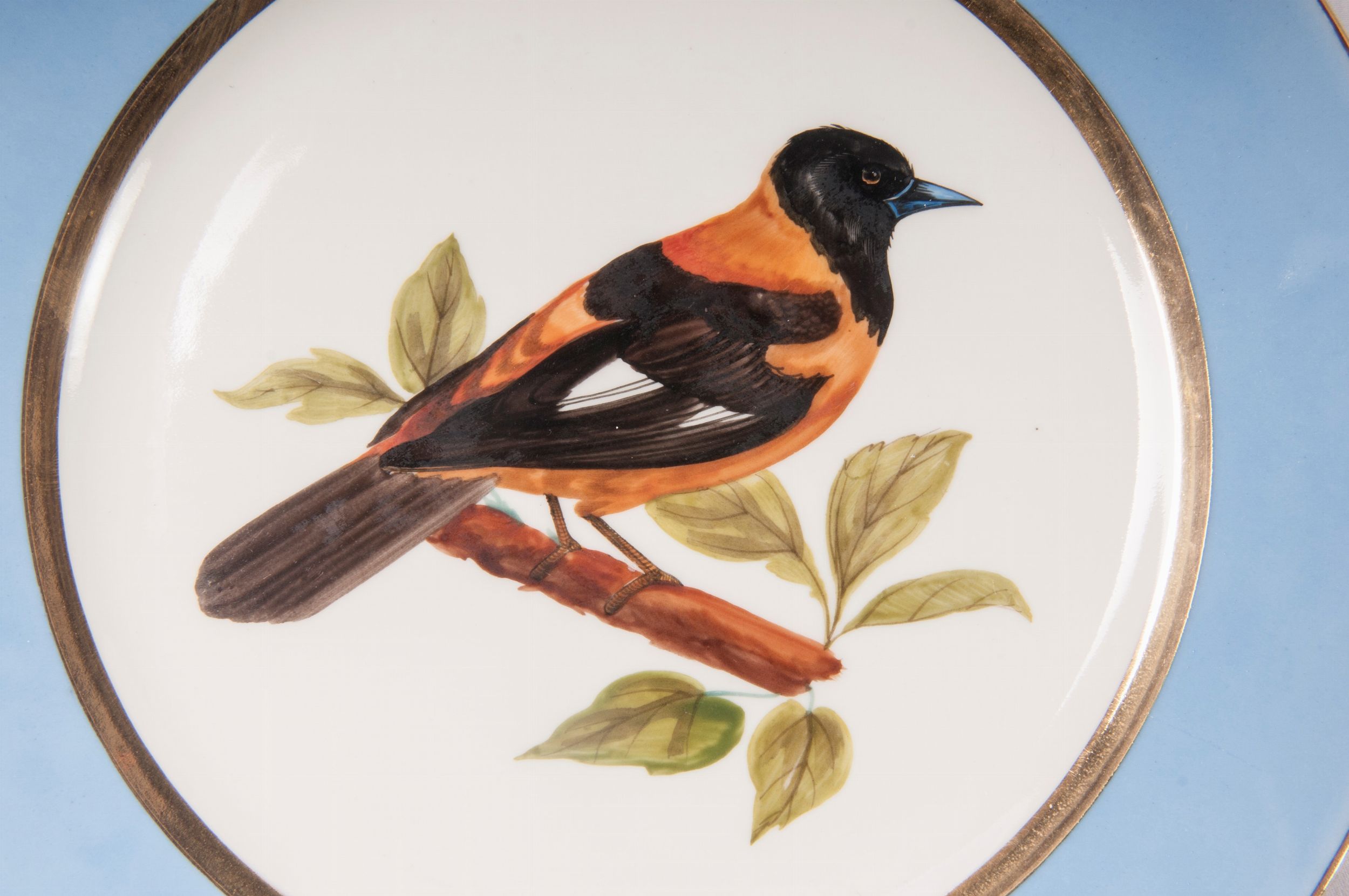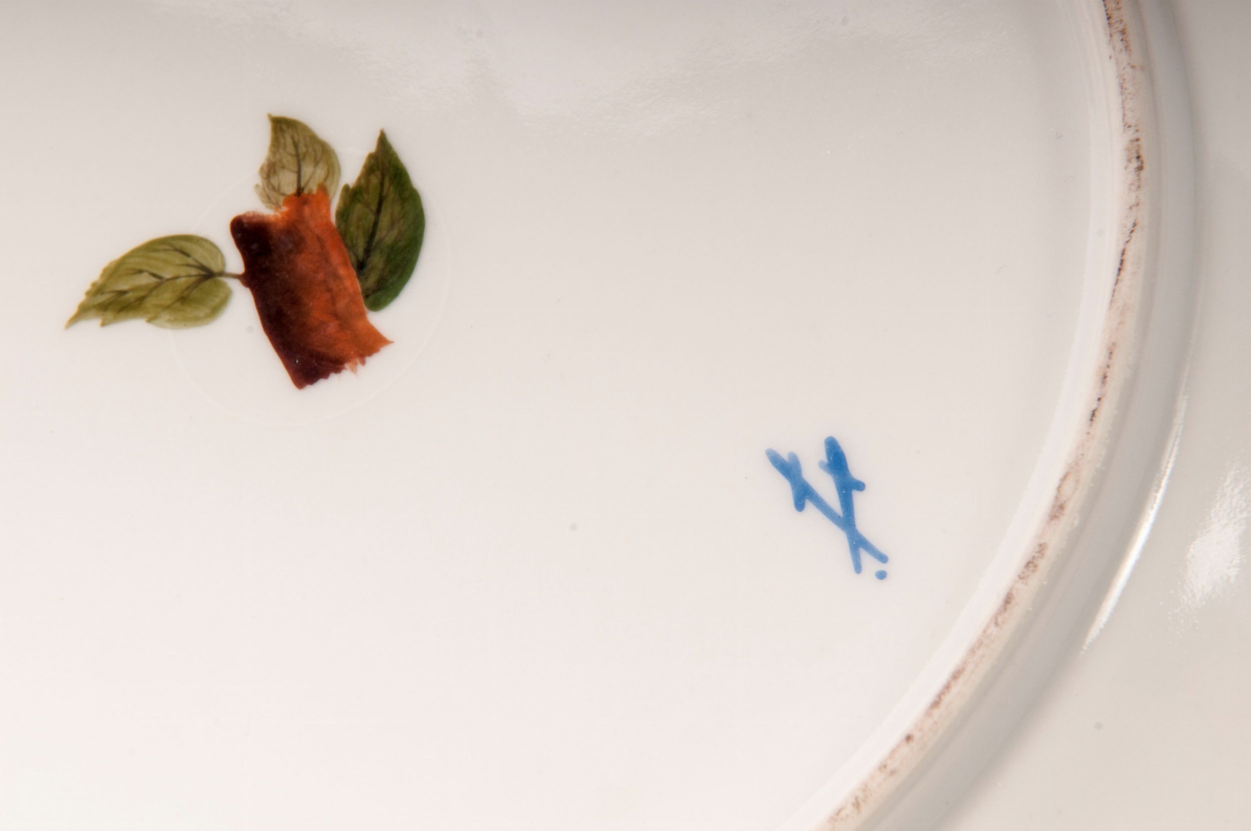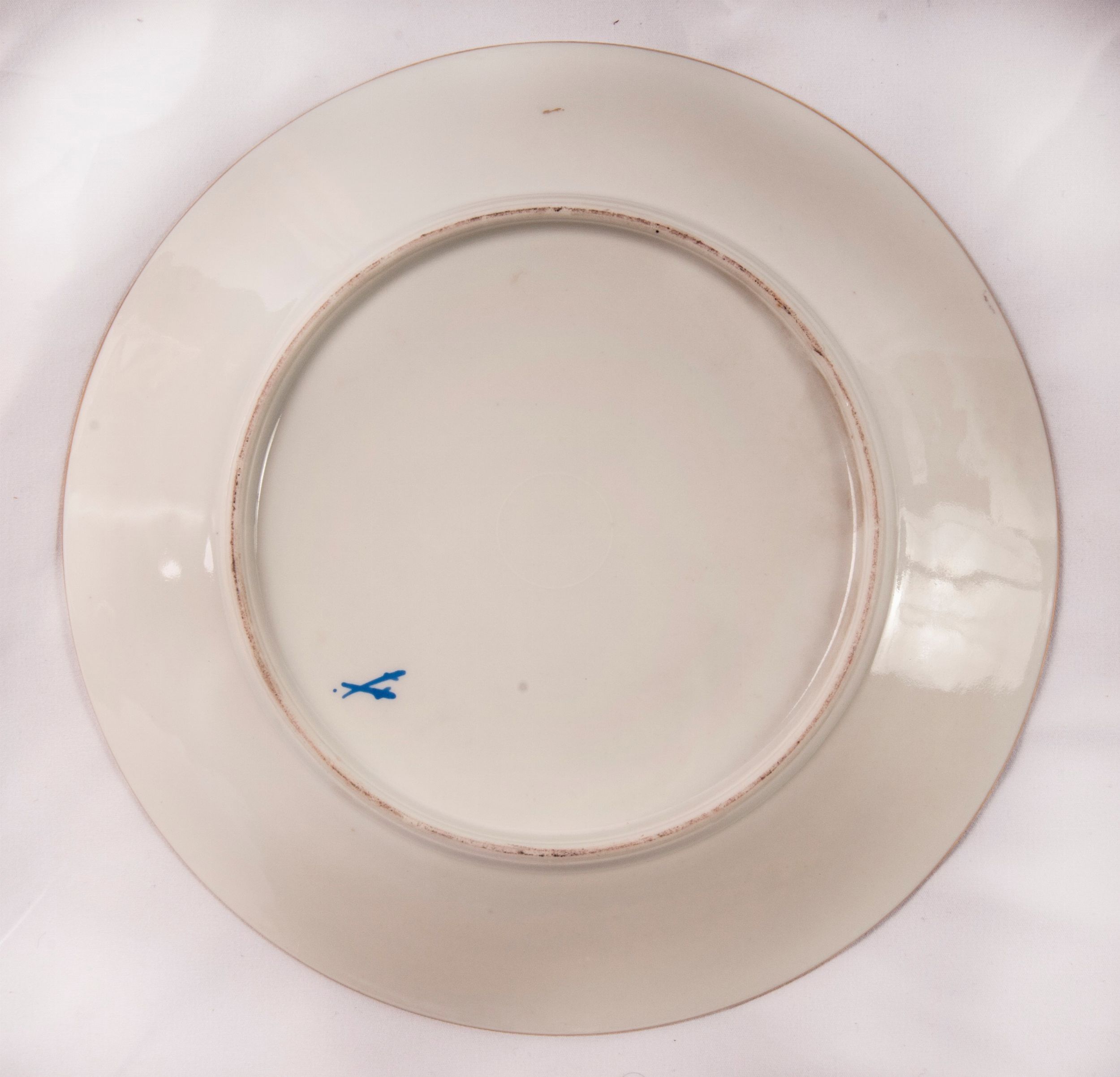 24, 5 x 2,5 cm in porcellana policroma con tesa in blu e finiture in oro zecchino. Fondo bianco con riproduzione di volatile. Retro ribassato con anello e segnatura della manifattura in blu sotto smalto. Meissen , prima metà XIX secolo Stato di conservazione: buono, usure come da uso nel tempo, due piatti restaurati,