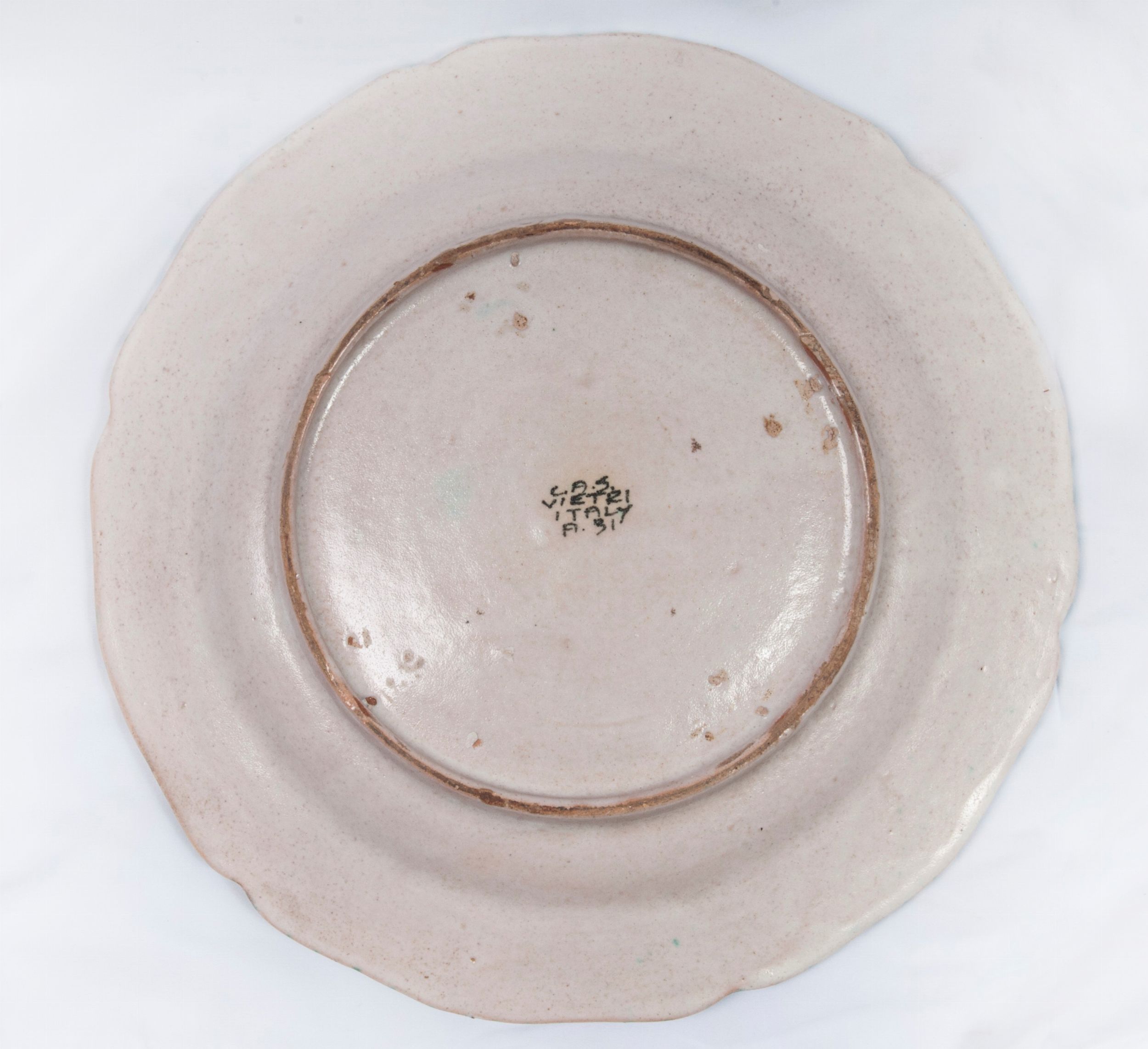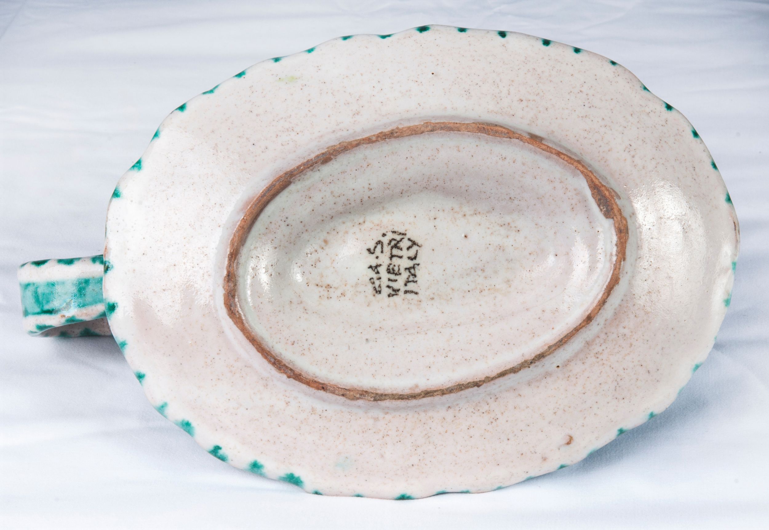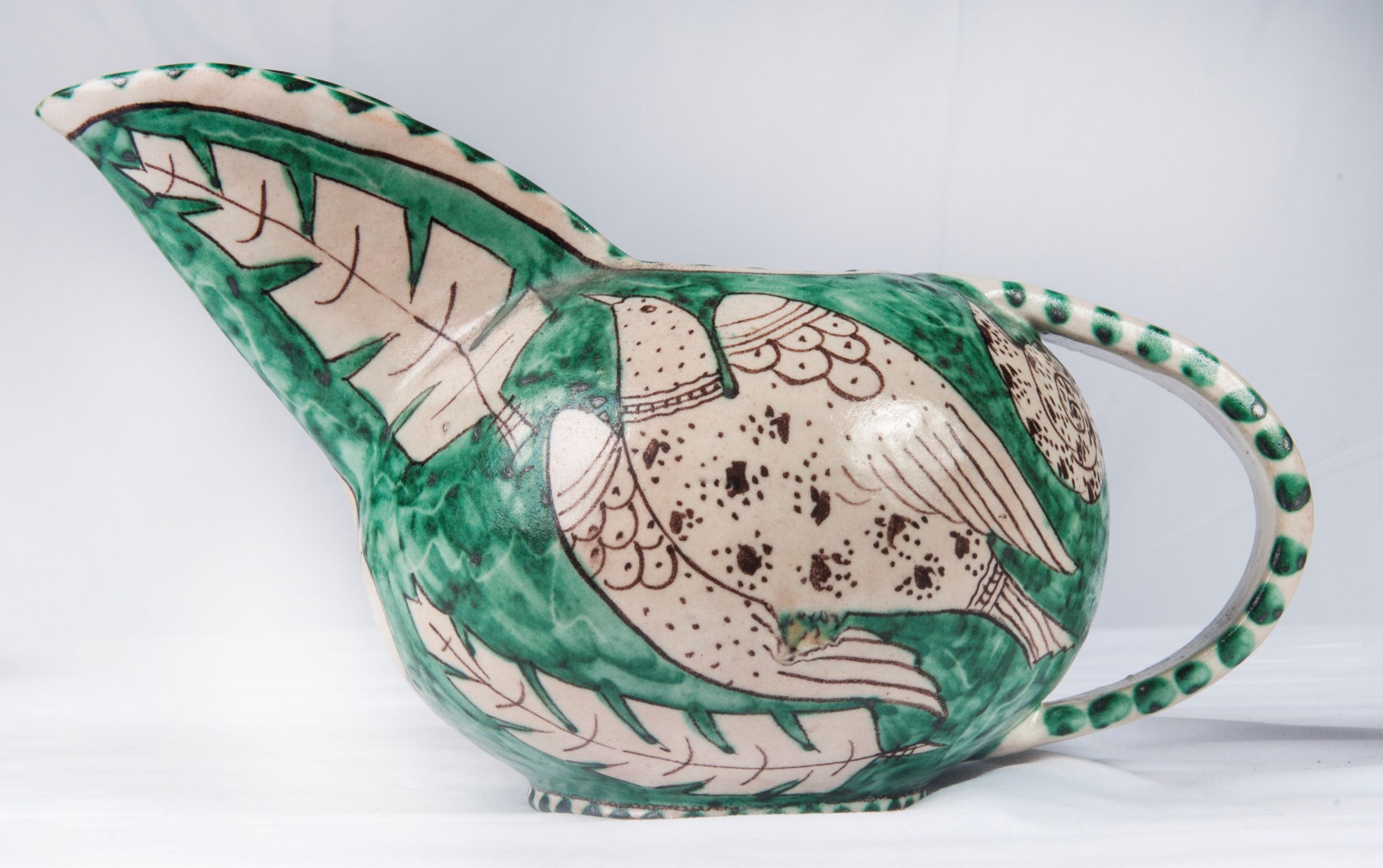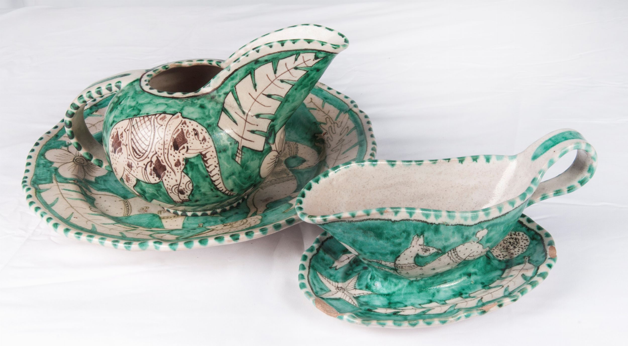 metà XX secolo composto da: un piatto da centro 32 x 4 cm; una brocca versatoio 15 x 8,5 cm; un salsiera 11 x 13 x 9 cm. Decoro in verde con figure di animali e di foglie su fondo bianco risparmiato. Manifattura C.A.S. Vietri Stato di conservazione: piccole mancanze lungo gli orli.