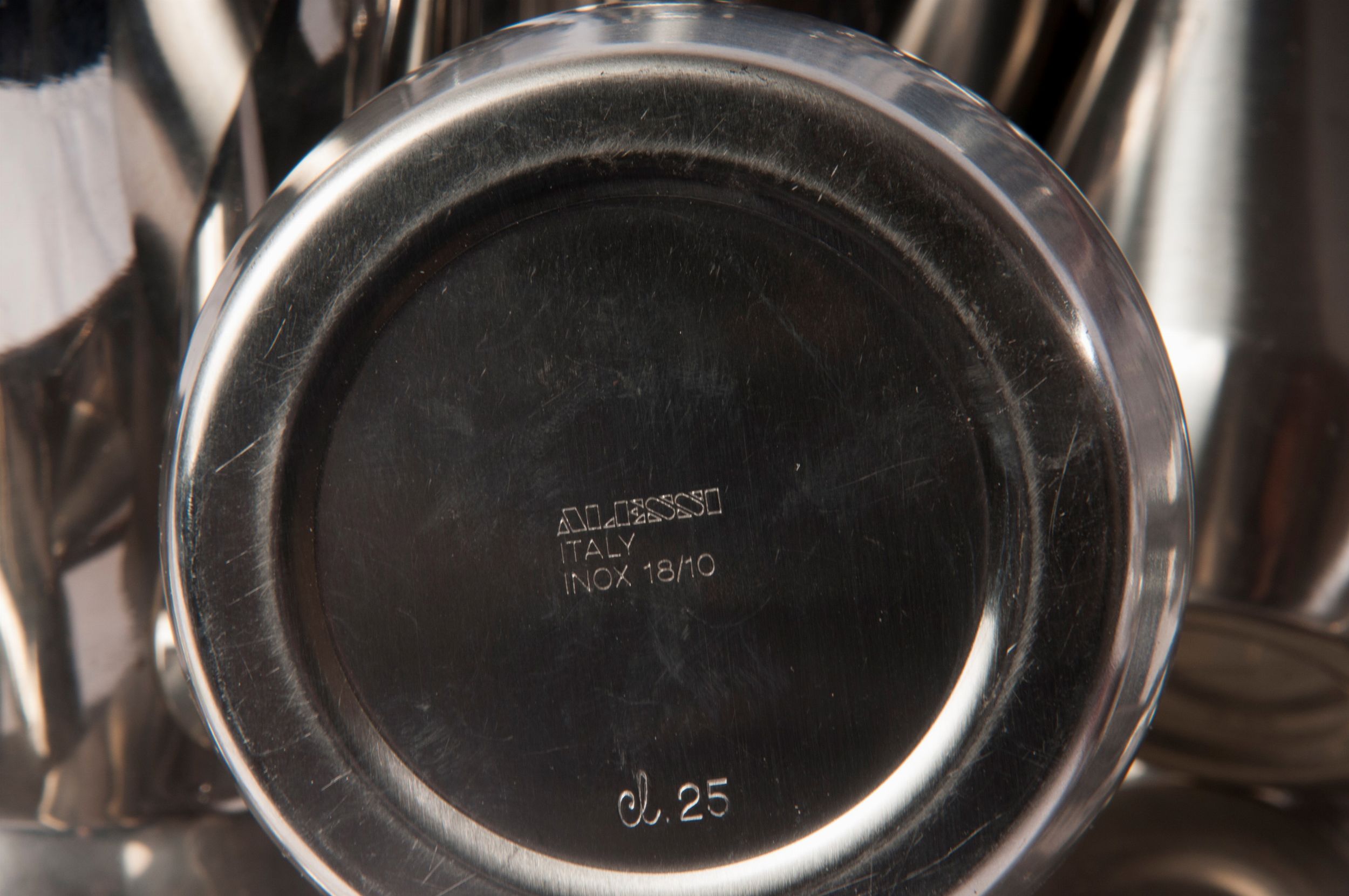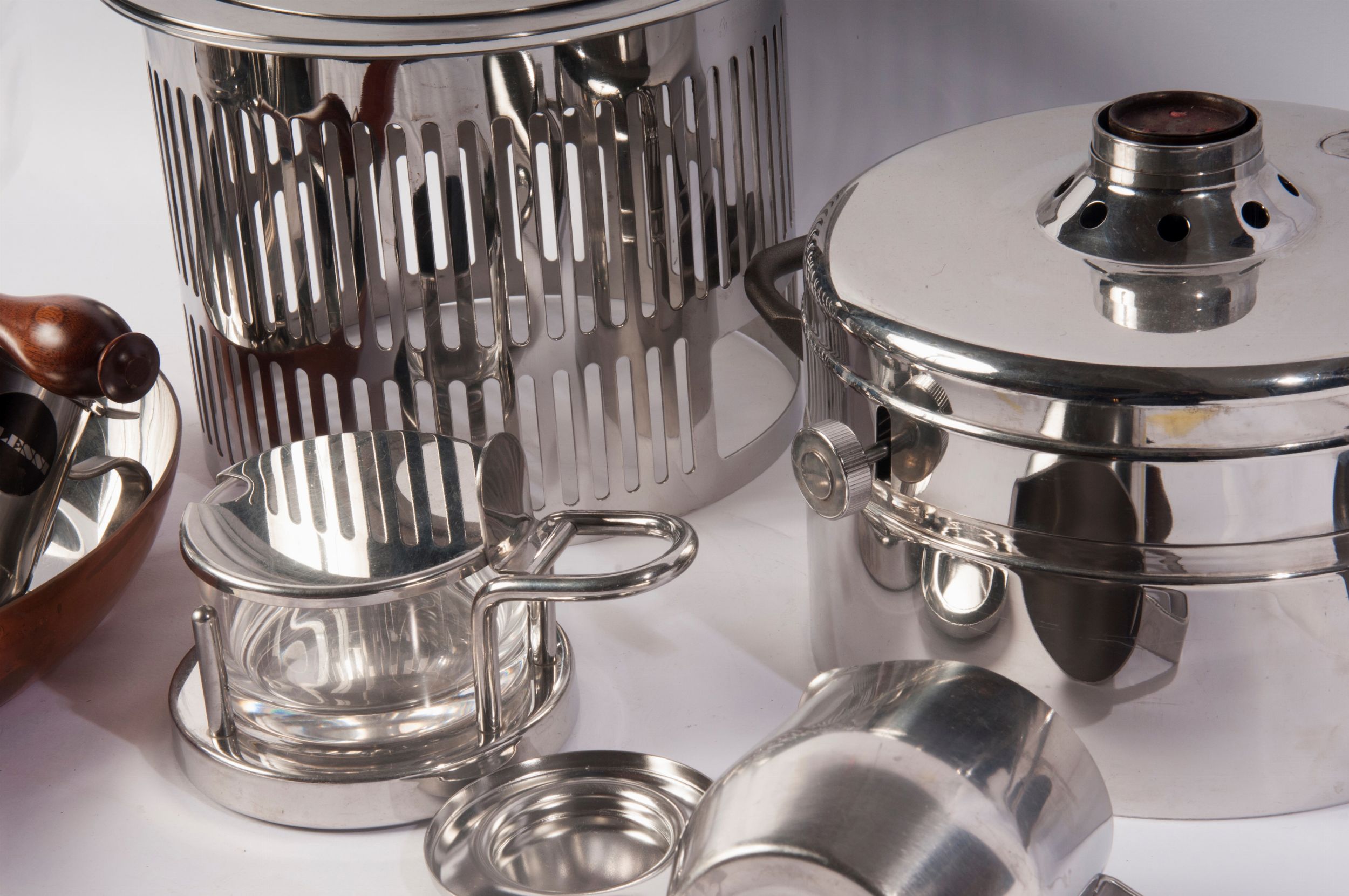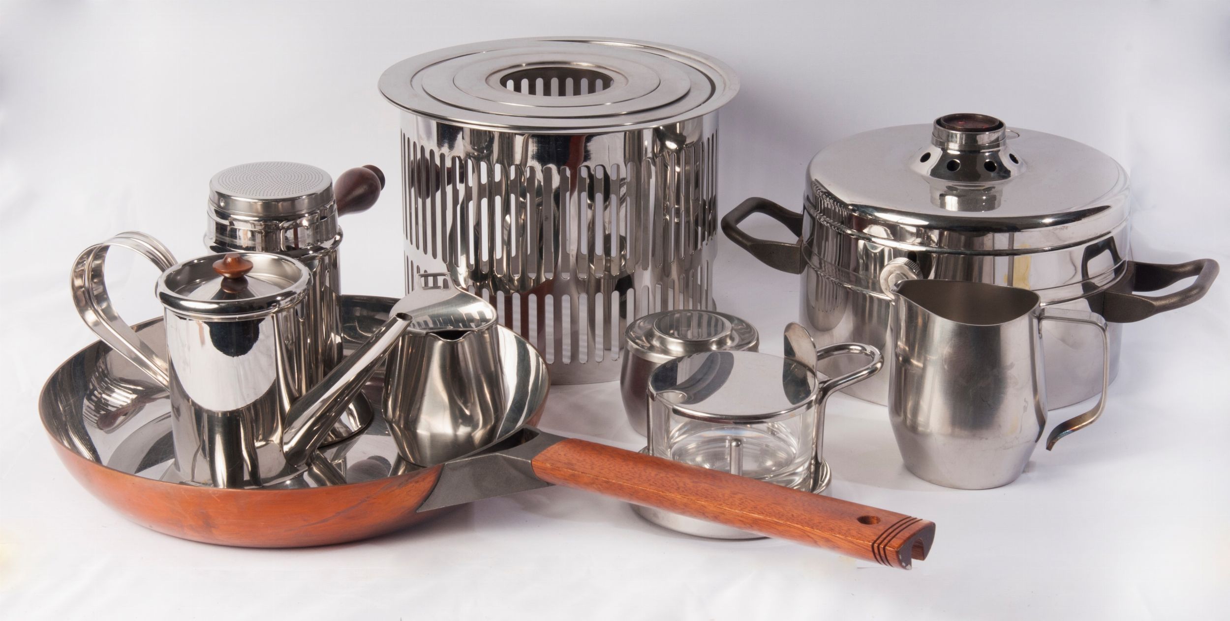 seconda metà XX secolo una caffettiera, una formaggiera, una zuccheriera,  due pentolini in acciaio, una padella in rame e acciaio. Manifattura Alessi Stato di conservazione: molto buono