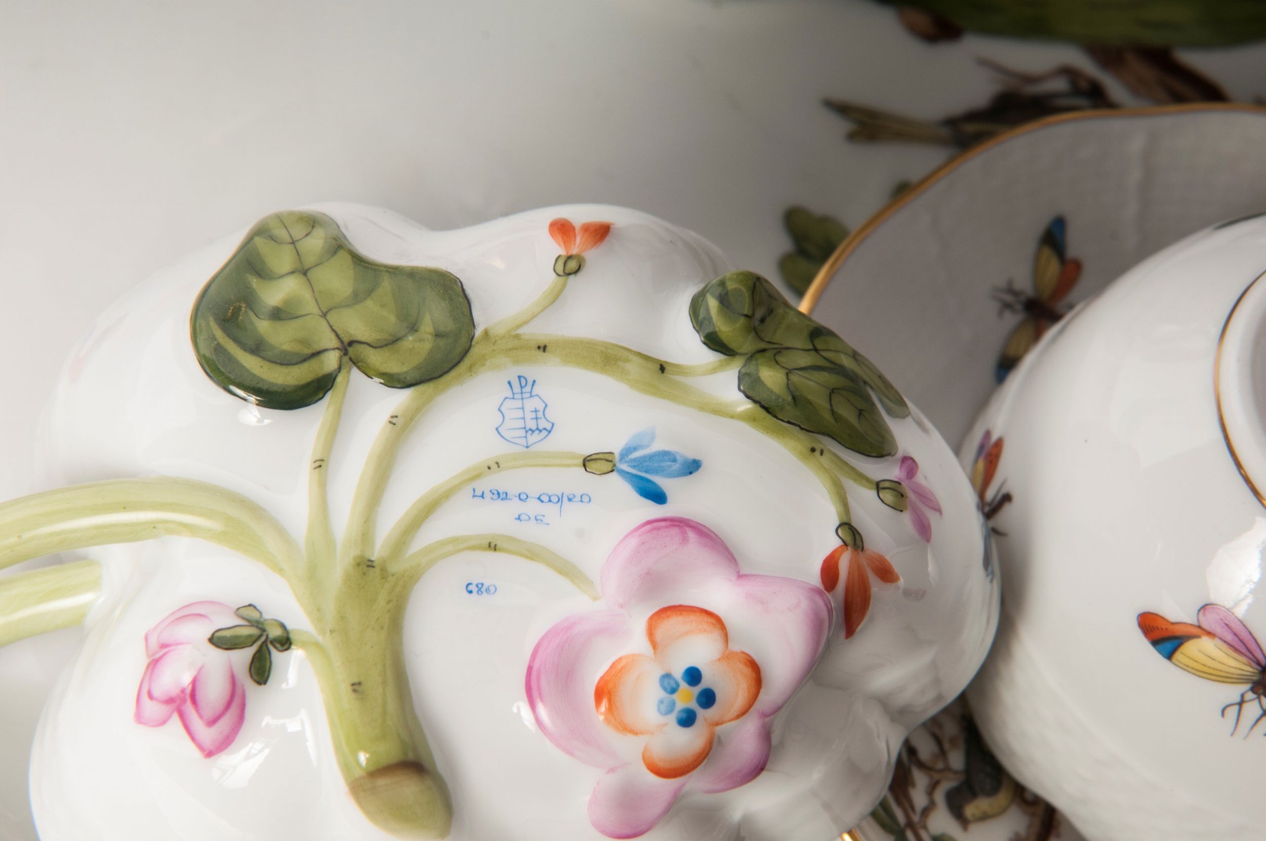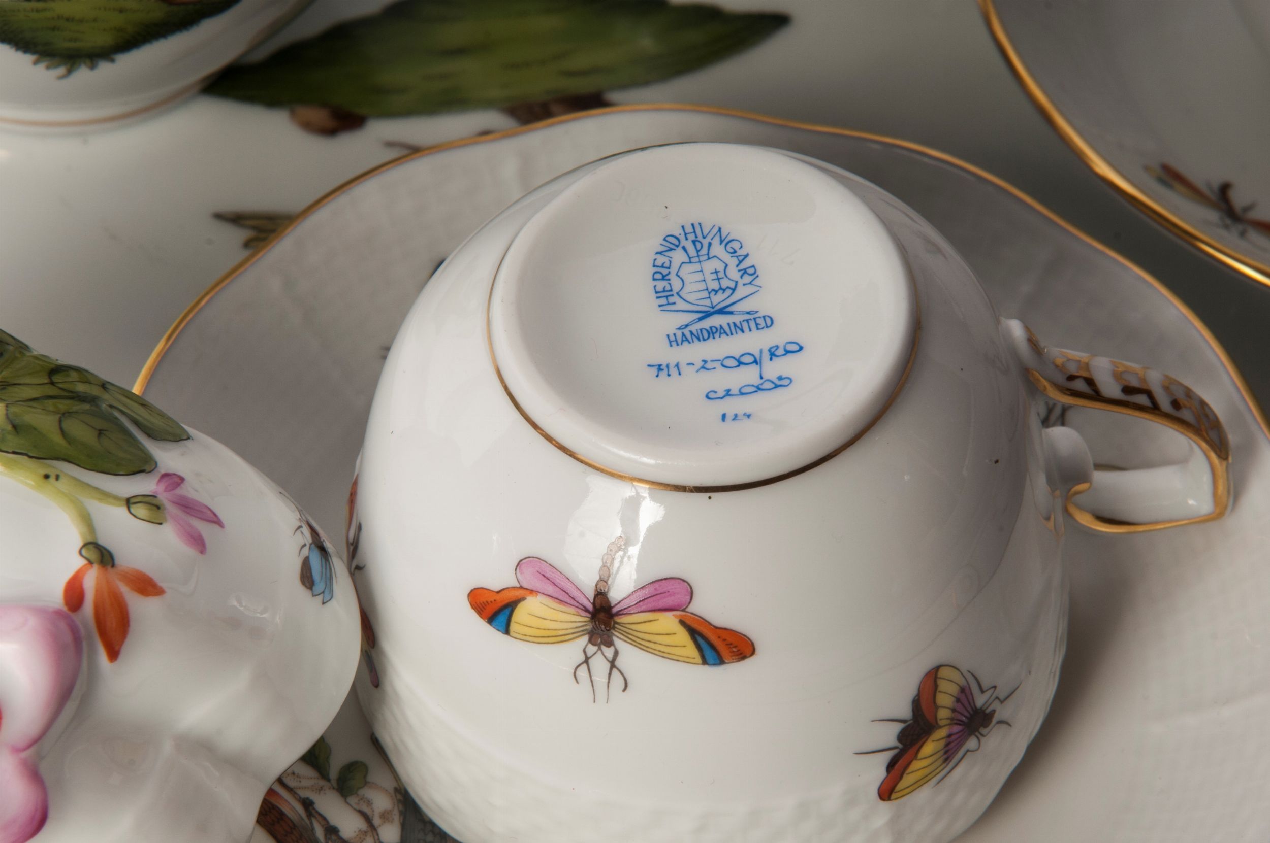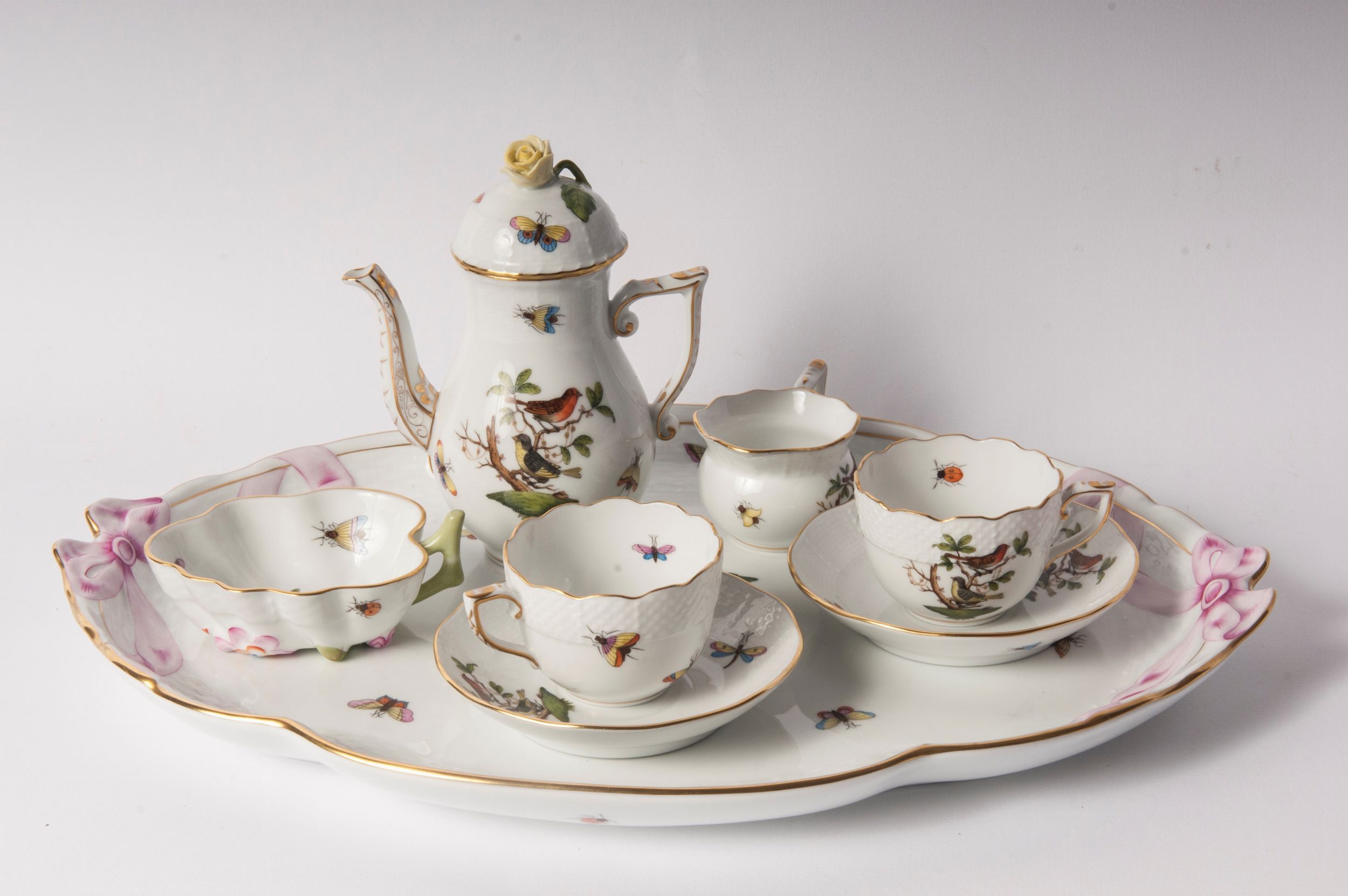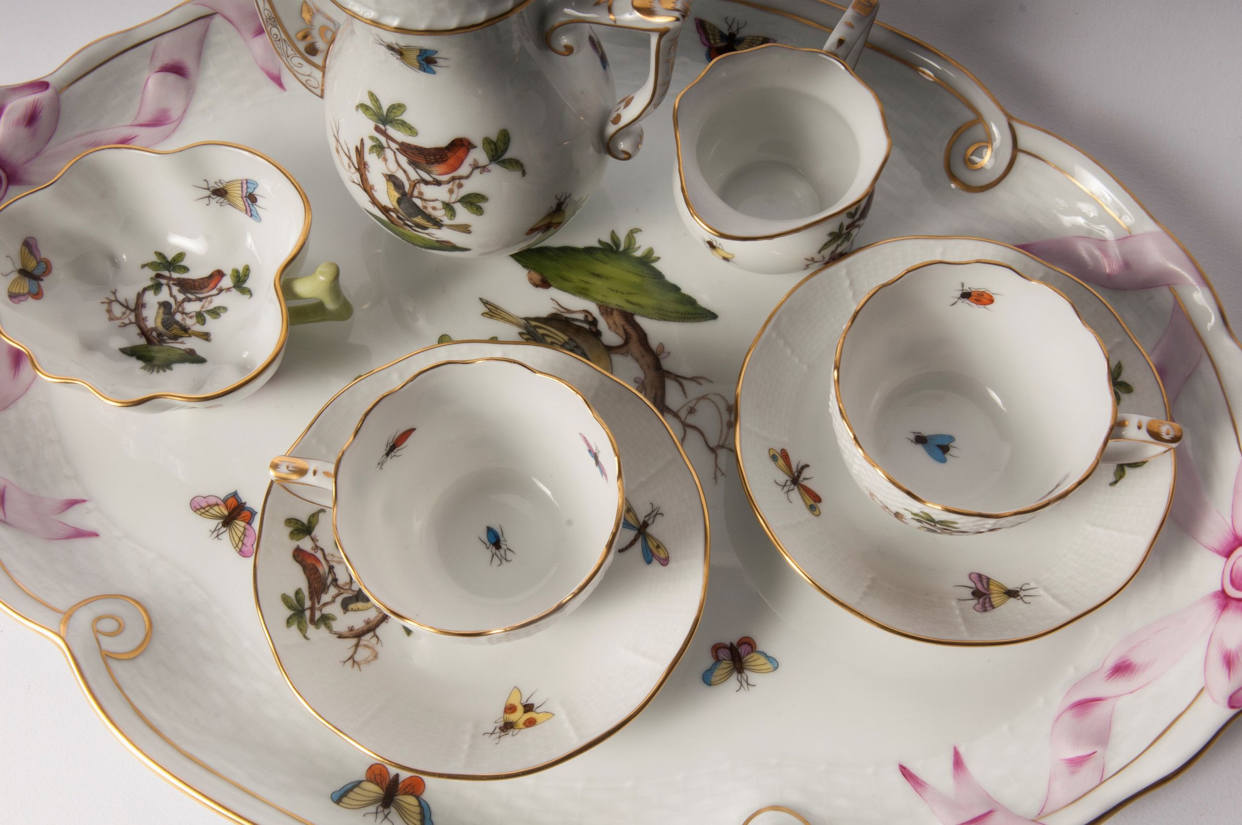 seconda metà XX secolo con due tazze con piatti , una caffettiera, una lattiera ed una zuccheriera. Decoro ad uccellini e farfalle su fondo bianco, manifattura di Herend Stato di conservazione: molto buono