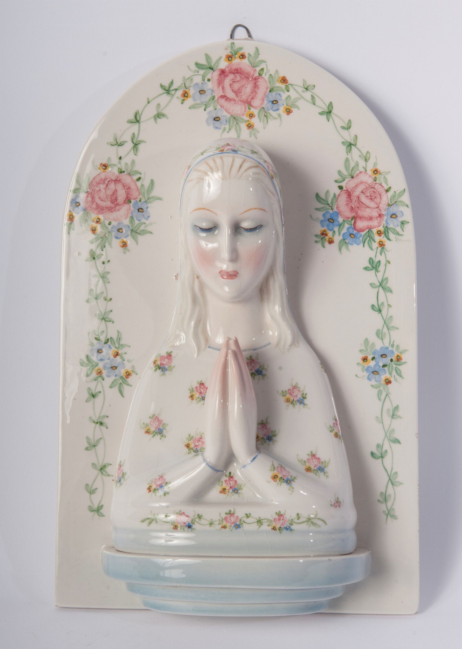 1942/49 scultura a colaggio in ceramica policroma. Manifattura Ronzan Giovanni, firma al retro in nero sotto smalto. Stato di conservazione: molto buono, difetti di cottura nello smalto