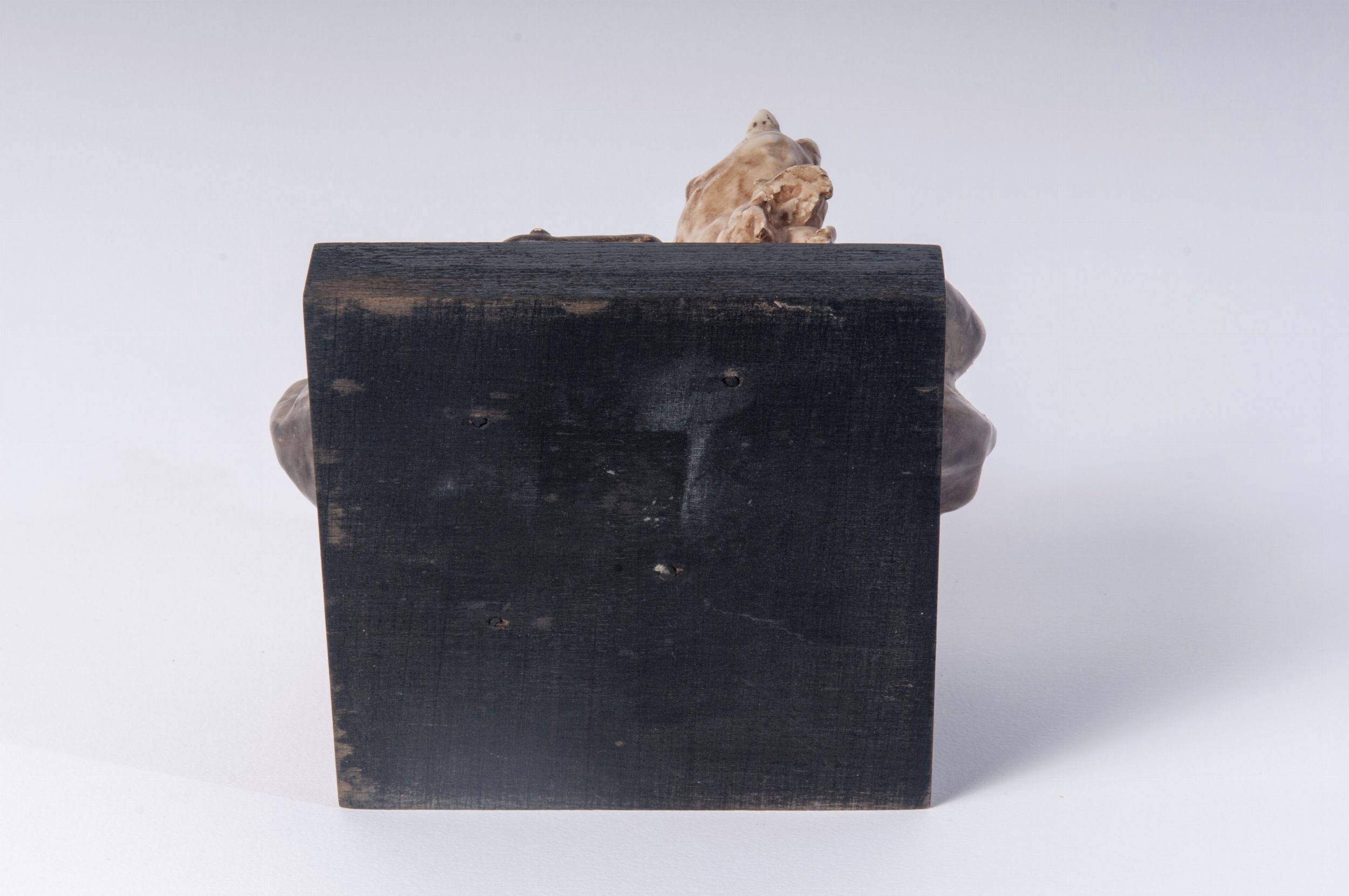 20 x 13 x 13 cm anni '30 scultura a tutto tondo in ceramica policroma con formatura a colaggio, su base in legno ebanizzato. Firma incussa nella pasta posteriore. Stato di conservazione: molto buono, piccola mancanza allo smalto sulla punta del piede sinistro.