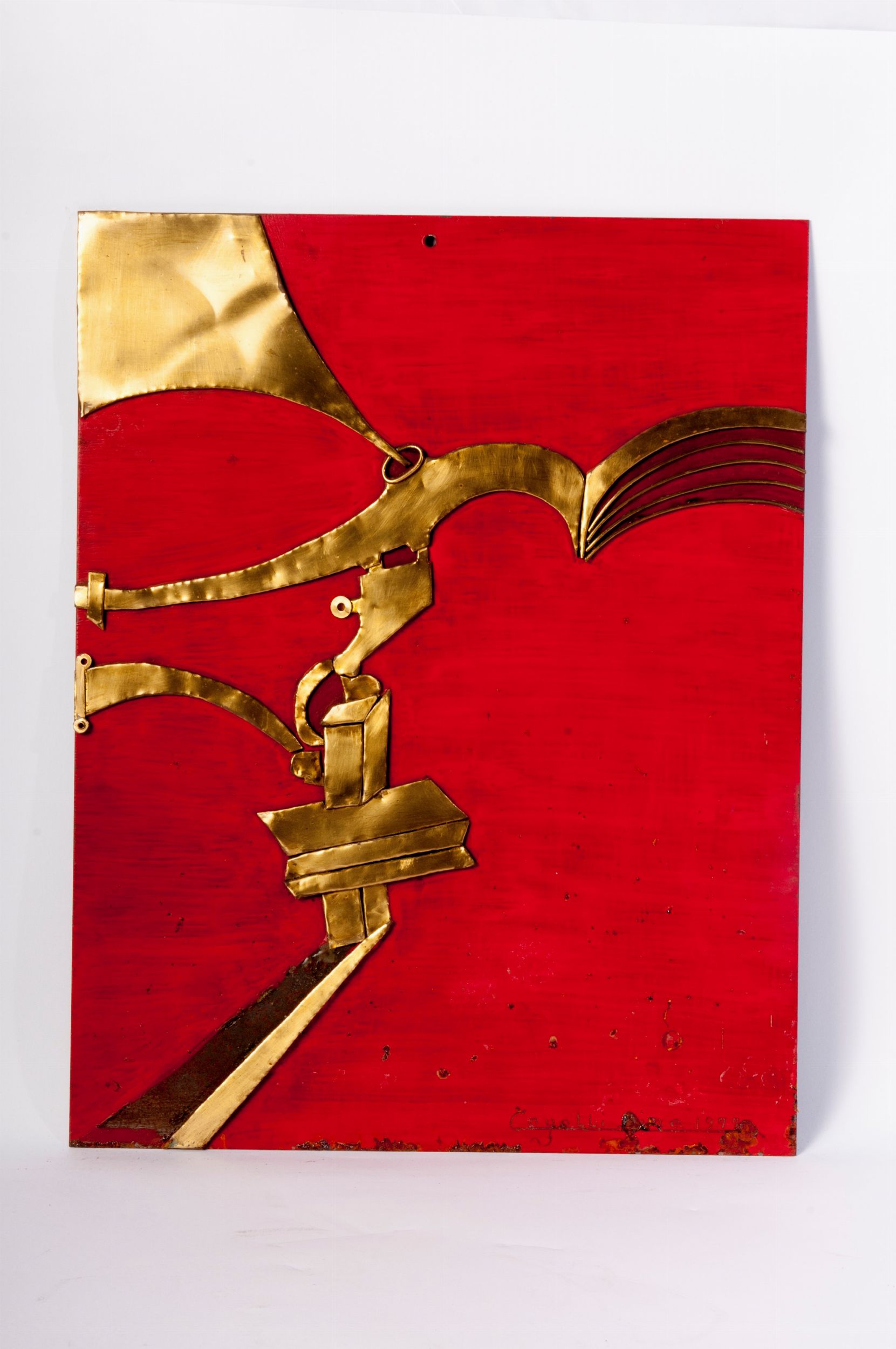 1977 scultura su piastra in ottone lavorato ad elementi informali applicati su lastra in metallo rosso. Firmata e datata autrice: Dina Cogolli. Stato di conservazione: buono.