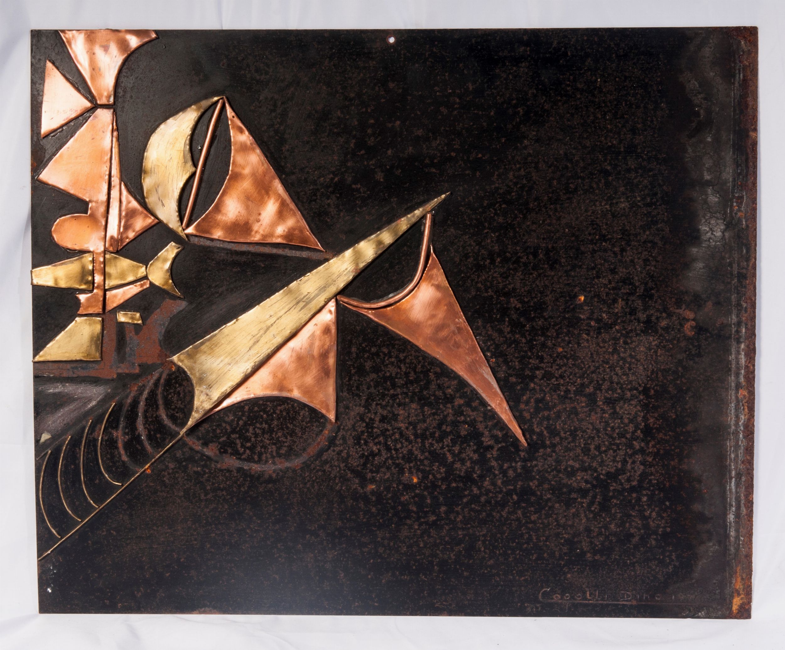 1976 scultura ad elementi informali in rame ed ottone applicati su piastra in metallo nero. Firmata e datata autrice: Dina Cogolli. Stato di conservazione: buono.