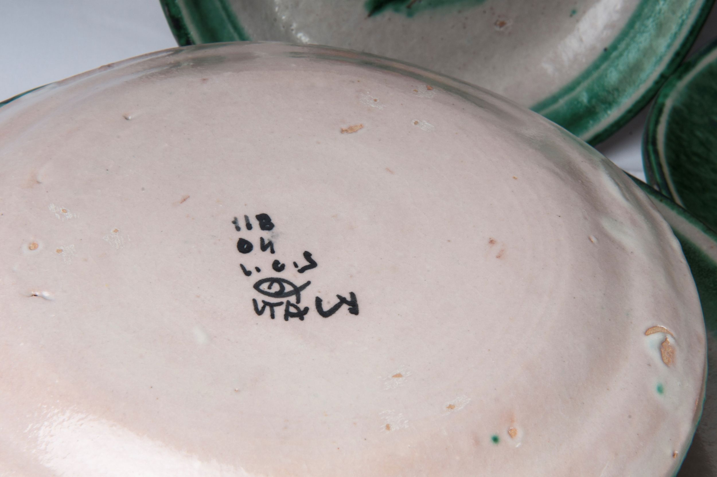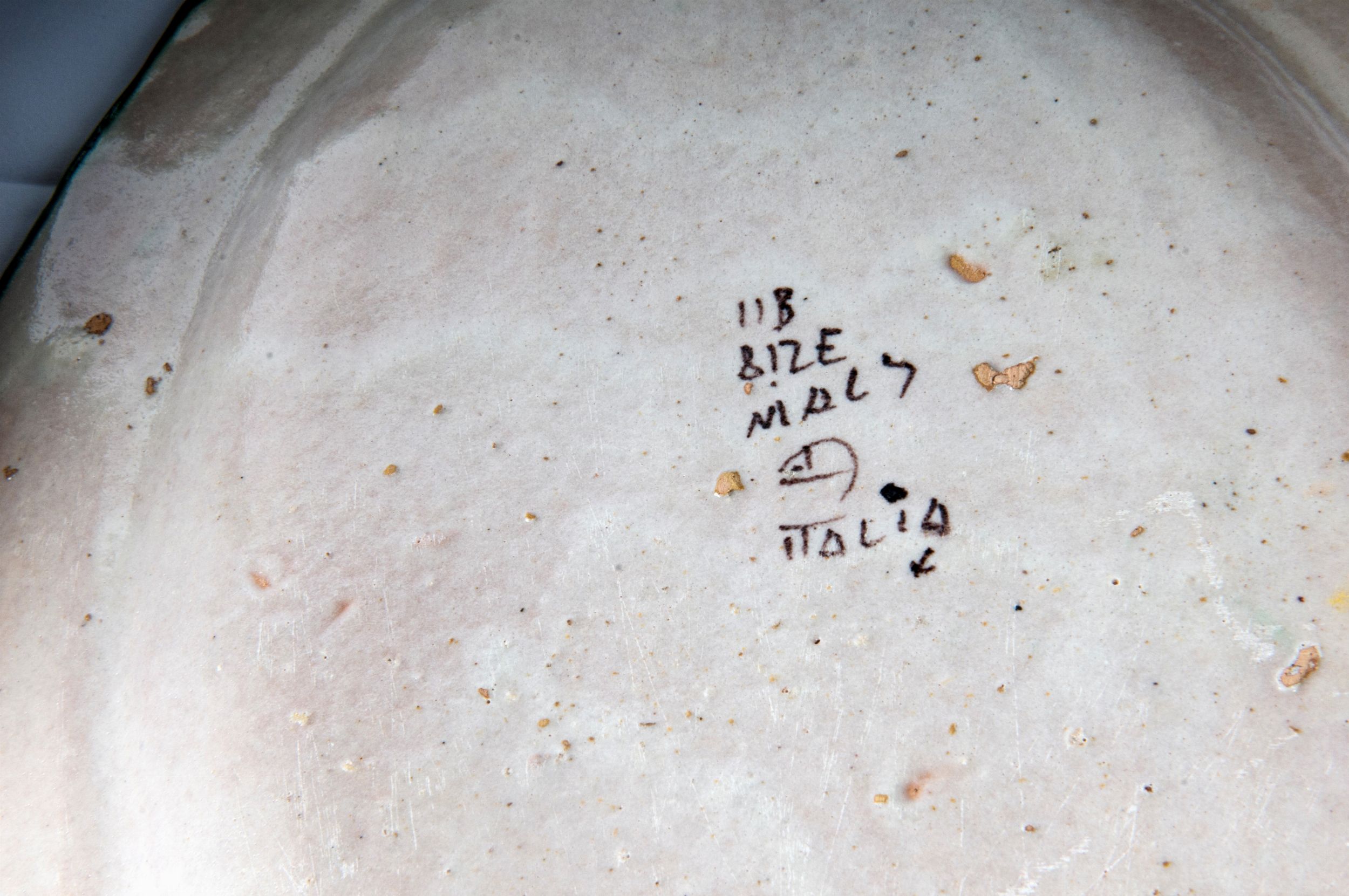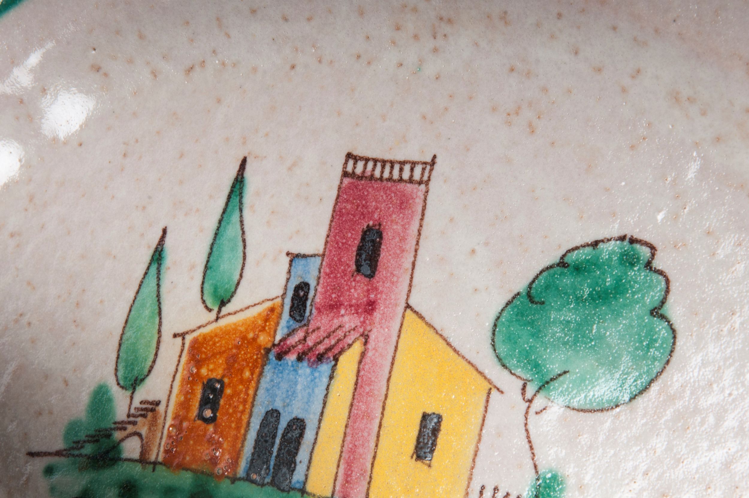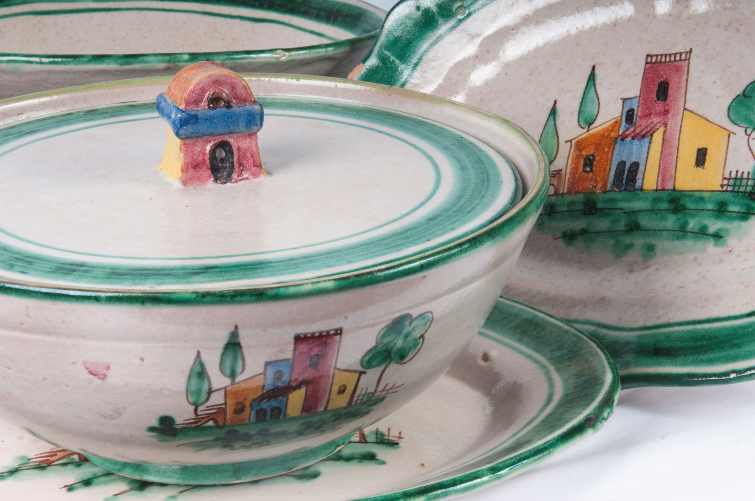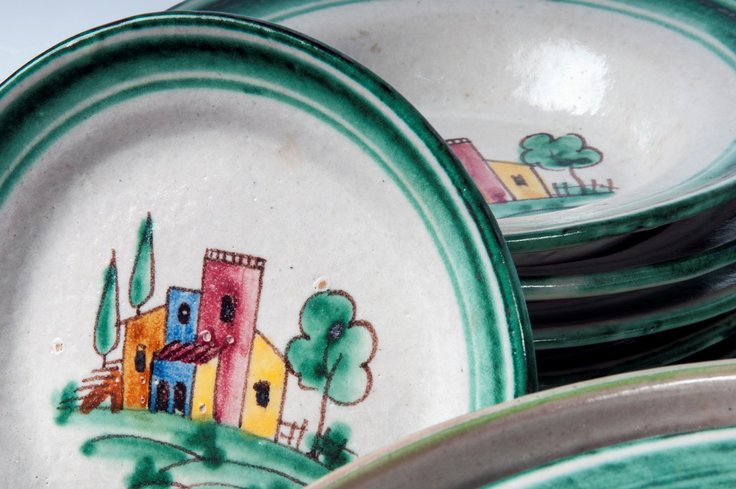Vietri ,1933/1939 periodo tedesco composto da: sei piatti da coltello, sei scodelle , sei piatti da dessert. tre vassoi da portata dei quali uno della Macs ,due insalatiere ed una zuppiera con coperchio. Decoro con fascia verde ramina lungo i bordi e paesaggio nel fondo, nelle cromie giallo, blu, rosa ed ocra su fondo bianco pz. 24. Manifattura I.C.S Stato di conservazione: molto buono