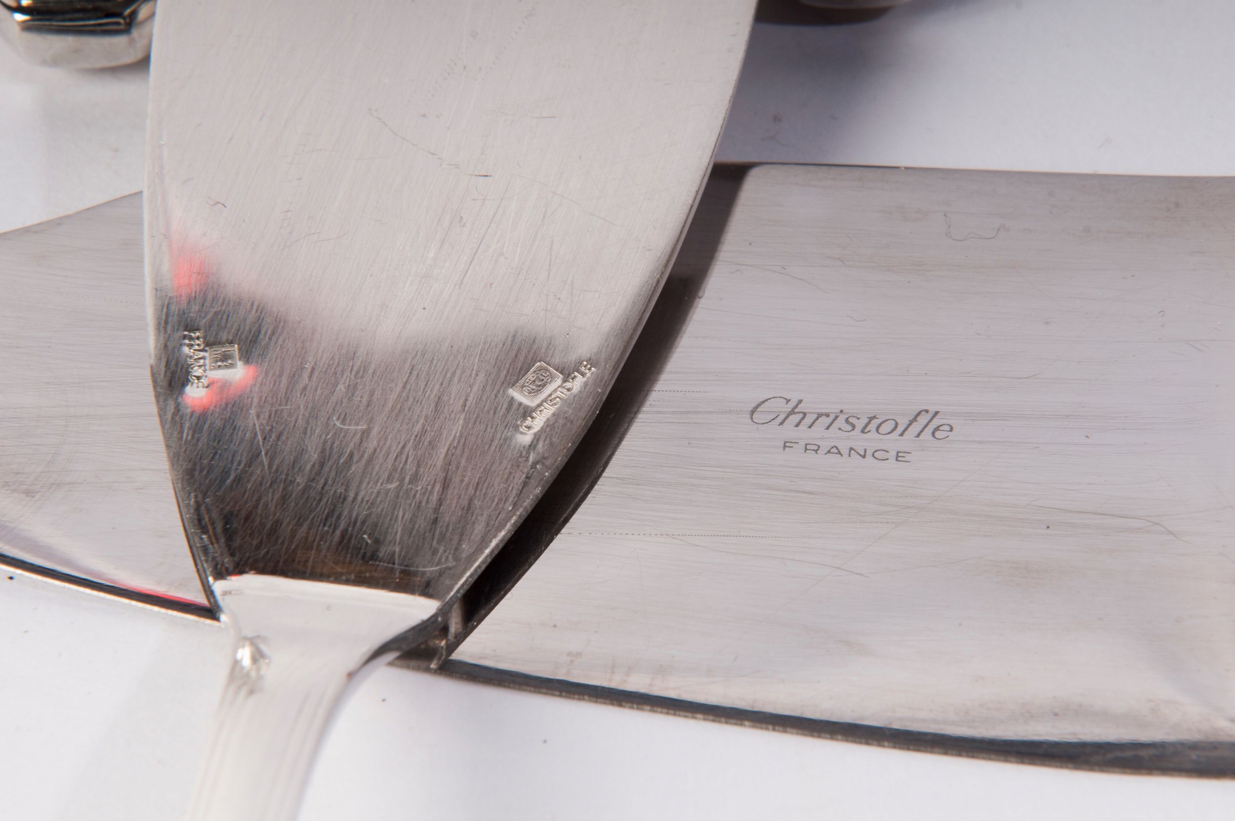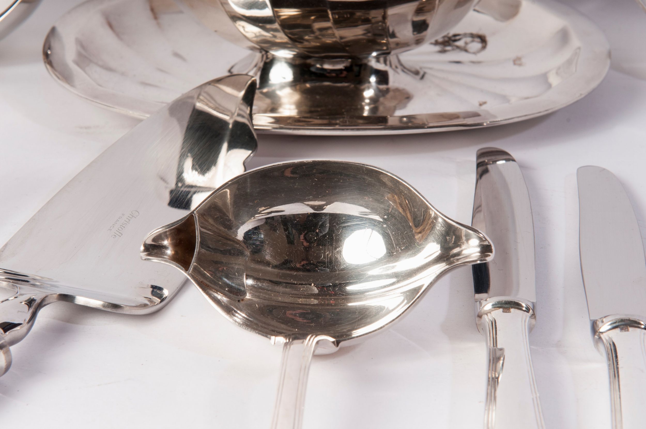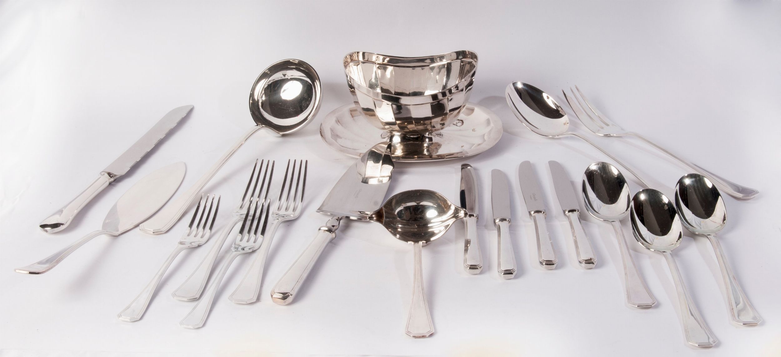 seconda metà XX secolo composto da: pz. 24 cucchiai, pz.24 forchette, pz.24 coltelli, pz.24 cucchiaini , pz.24 forchette da dessert ,pz.24 coltelli da dessert, pz.24 forchette pesce, pz.24 coltelli pesce, coltelli da burro e formaggi pz.3, un forchettone da pesce, una paletta torta, un mestolo, una forchetta da insalata, un coltello da pane, una forchetta e un cucchiaio da servito, una salsiera ed salsiera con mestolo. pz. 206
