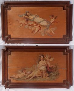 dipinti ad olio su tavola, 38 x 70 cm; 37,5 x 70 cm figure femminili con putti in cornici. Stato di conservazione: [..]