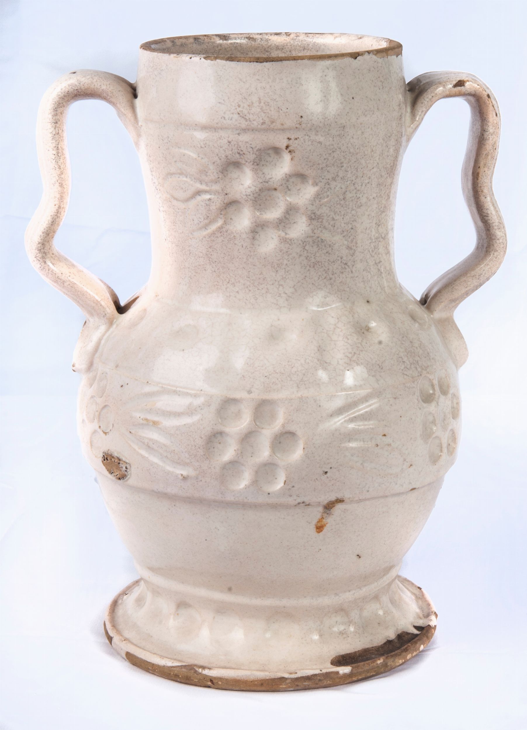29 x 12 x 16,5 cm Puglia, fine XIX secolo inizio XX secolo di forma cilindrica con due anse a nastro, dall' alto collo e piede svasato verso il basso con orlo rialzato. Decoro a fiori stilizzati incussi nella materia. Stato di conservazione: buono, difetti allo smalto.