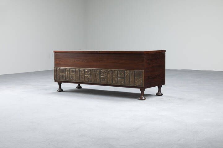 Cassapanca in legno con fronte arricchito da placca in bronzo lavorato. Anni '60 cm 47x118 5x41