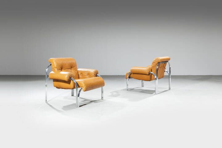 Struttura in acciaio. seduta e schienale imbottiti rivestiti in pelle. Anni '70 cm 75x90x86 Difetti