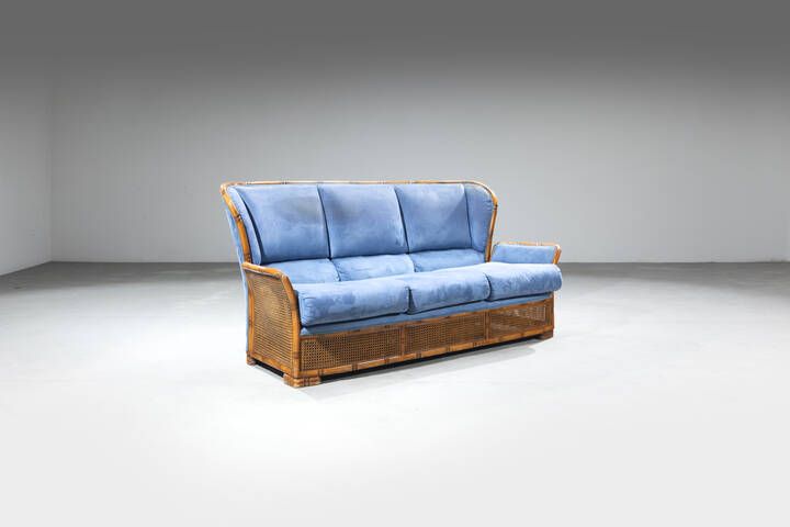 Struttura in bambù e rattan imbottitura rivestita in tessuto. Anni '60 cm 93x198x95 Difetti