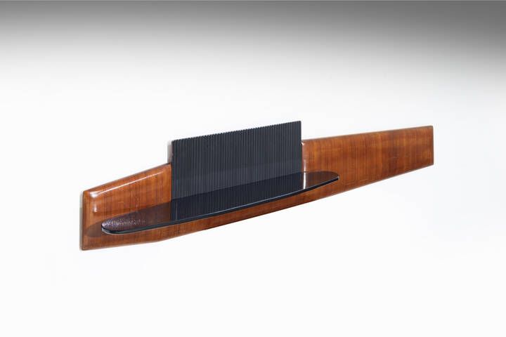 Struttura in legno impiallacciato legno grissinato e piano in vetro colorato. Anni '50 cm 35x174x21 Difetti
