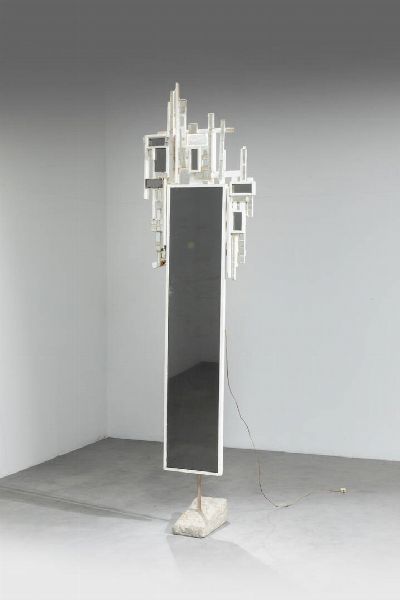 Struttura in metallo e legno elementi in vetro specchiato. Base in pietra Retro-illuminato Firma data e titolo al retro 1966 h cm 237x61