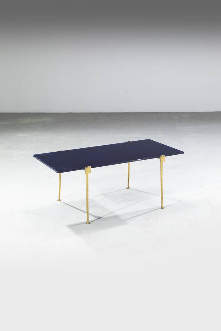 Struttura in fusione di ottone e piano in vetro colorato. Anni '50 cm 41x100x51 Piccoli difetti