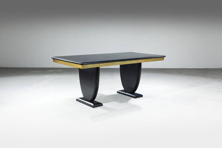 Struttura in legno tinto all'anilina piano in vetro fumè. Prod. Valabrega anni '40 cm 78 5x182 5x99