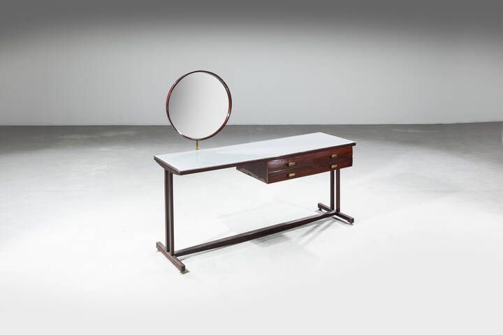 Struttura in legno piano in vetro elemento in vetro specchiato e particolari in ottone. Anni '60 cm 125x150x47 Difetti