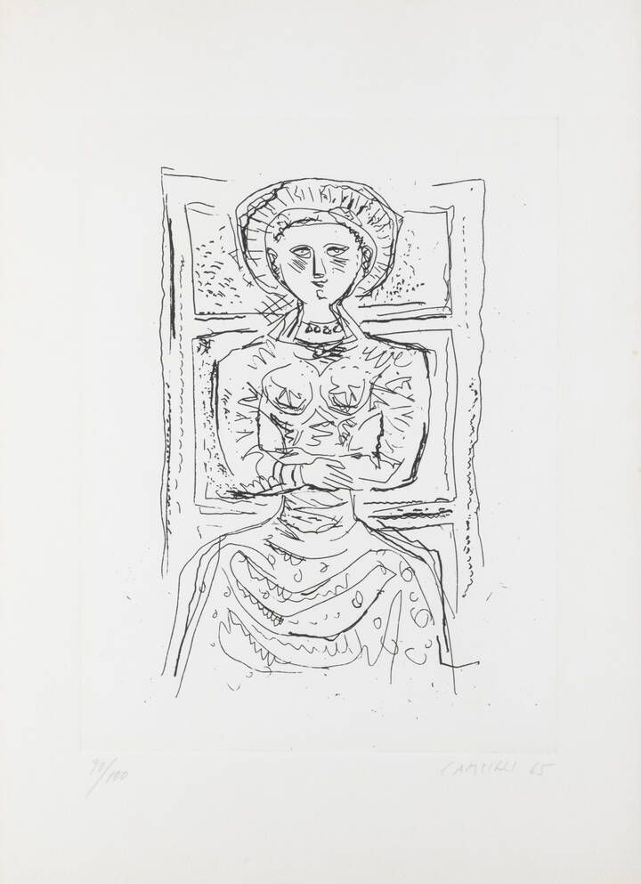 50x35 foglio 32x24 5 acquaforte es. 90/100 Opera firmata e datata in basso a destra e numerata in basso a sinistra (a matita sul foglio) Alcune prove in parte firmate 100 esemplari numerati con cifre arabe e 4 esemplari siglati da A a D tutti firmati e datati su carta Fabriano per gli esemplari di testa del volume Campigli Pittore di Franco Russoli editore II Milione Milano 1965. Stampatore Grafica Romero Roma. Nel 1981 furono inoltre tirate alcune prove 300 esemplari numerati con cifre arabe e 125 esemplari numerati con numeri romani tutti in ocra e con la firma dell'artista impressa a stampa su carta Mulino del Gallo per essere allegati all'edizione di testa del catalogo pubblicato in occasione della presentazione delle cartelle Le Memorie di Casanova con testi di Italo Calvino. Salamon e Tonini Editori Roma 1981. Stampatore Sciardelli Milano. Bibl.:-F. Meloni L. Tavola Campigli: catalogo ragionato dll'opera grafica (litografie e incisioni) 1930-1969 Edizioni Graphis Arte Livorno ripr. n. 201 p. 171.