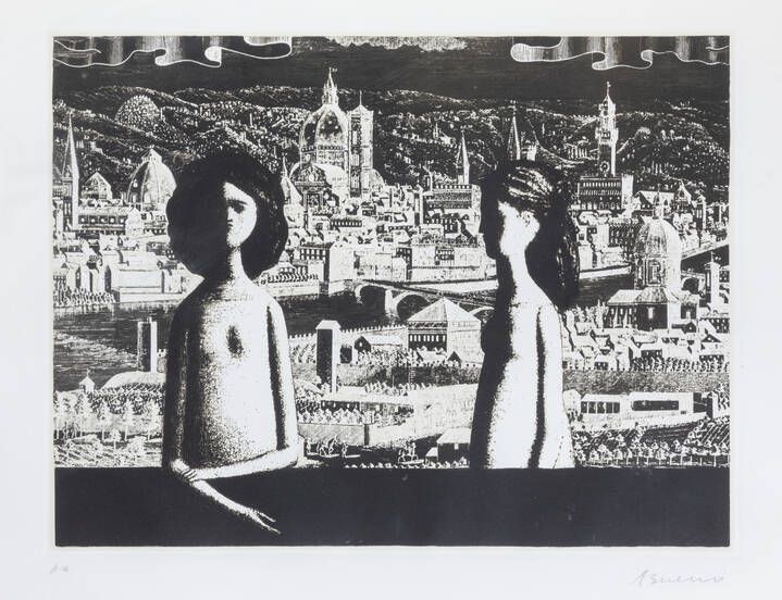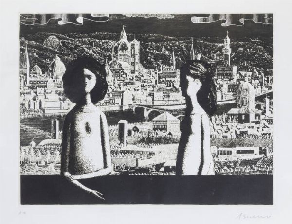 50x70 foglio 31x40 9 fotolitografia prova d'artista Opera firmata in basso a destra e iscritta p.a. in basso a sinistra (a matita sul foglio) Piccole macchie sul foglio e lungo i bordi