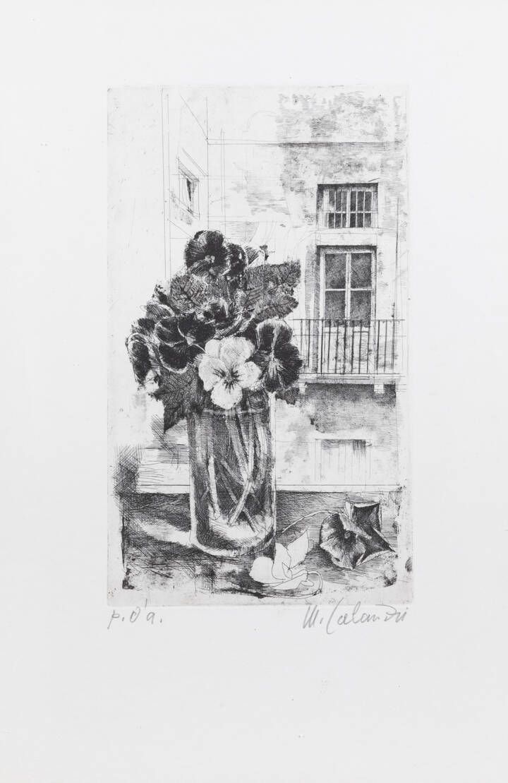 50x34 8 foglio 19 1x32 3 acquaforte e puntasecca prova d'artista Opera firmata in basso a destra e iscritta in basso a sinistra p.d'a. (a matita sul foglio) Esp.:-1985 Canelli (AT) Centro per la cultura e pe rl'arte L. Bosca. Acqueforti tra gli anni 1937-1985 Bibl.:-R. De Grada E. Caballo L. Carluccio Mario Calandri acqueforti tra gli anni 1937-1985 Canelli 1985 -M. Fagiolo dell'Arco F. Fanelli V. Gatti Catalogo generale delle opere di Calandri - Le incisioni - 1937/1991 Allemandi Torino 1996 ripr. al n. 306 p. 203
