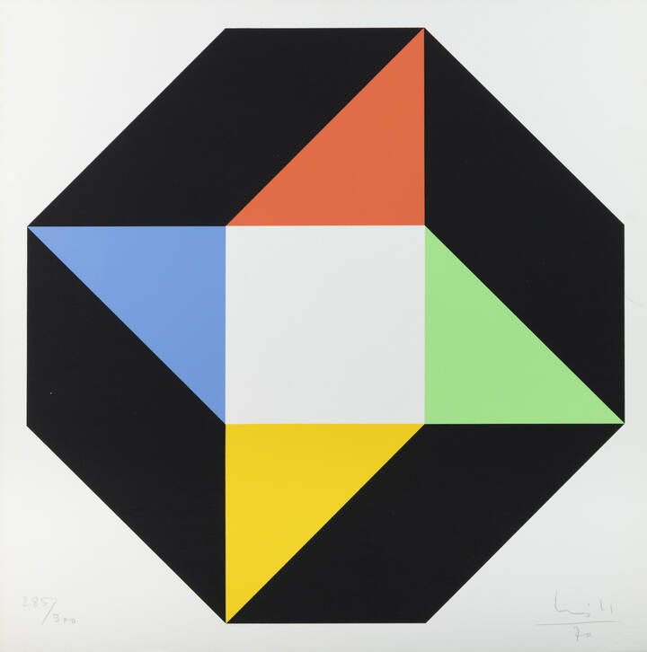 50x50 foglio 44 6x44 8 serigrafia es. 285/300 Opera firmata e datata in basso a destra e numerata in basso a sinistra (a matita sul foglio) Timbro a secco di Edizioni del Deposito Genova in basso a destra