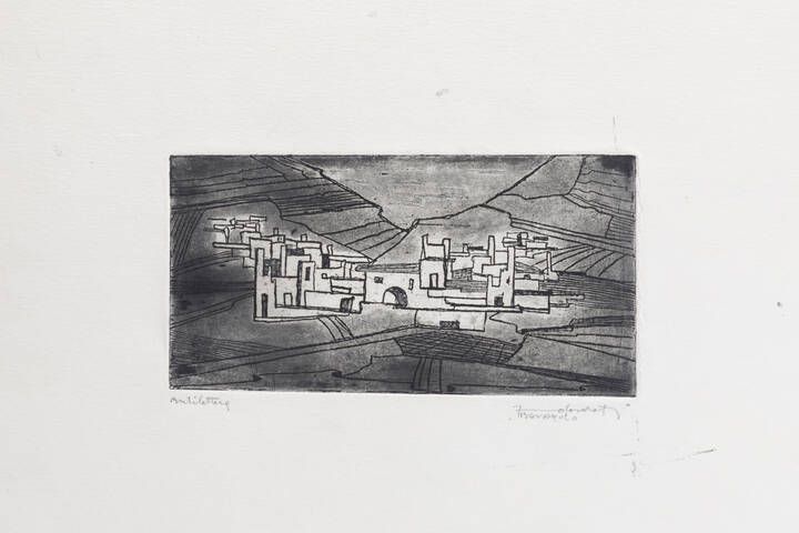 25x35 foglio 8.3x16.2 incisione antilettera Opera firmata e intitolata in basso a destra e iscritta antilettera in basso a sinistra (a matita sul foglio) Provenienza: Collezione privata del critico d'arte Marco Vallora Difetti (macchie)