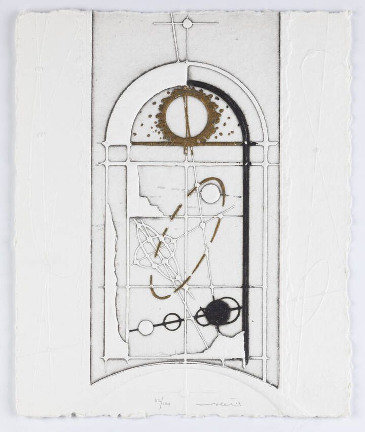 27 5x22 5 acquaforte e calcografia Opera firmata e numerata in basso al centro (a matita sul foglio) A corredo il catalogo: S. Parmiggiani Corrado Mingardi (a cura di) Parole disegnate parole dipinte. La collezione Mingardi di libri d'artista catalogo della mostra tenuta a Palazzo Magnani Reggio Emilia 4 febbraio-28 marzo 2005. Nella mostra venne esposto il catalogo d'artista Mario Luzi. La notte viene col canto. Walter Valentini con 4 incisioni fuori testo di Valentini