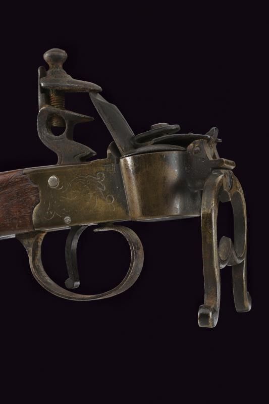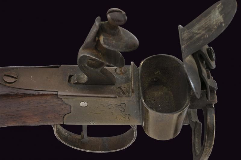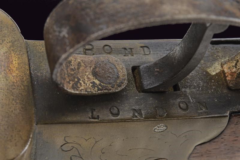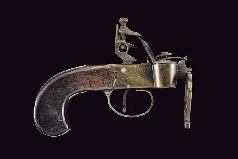 Londra, lunghezza 13.5 cm. 1800 circa Con grande scodellino in ottone in un unico pezzo con il castello di tipo boxlock inciso a fiorame, sul fondo firmato 'BOND LONDON'; copriscodellino in ferro, nella parte inferiore un piedistallo; impugnatura liscia in legno.