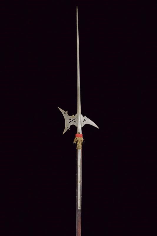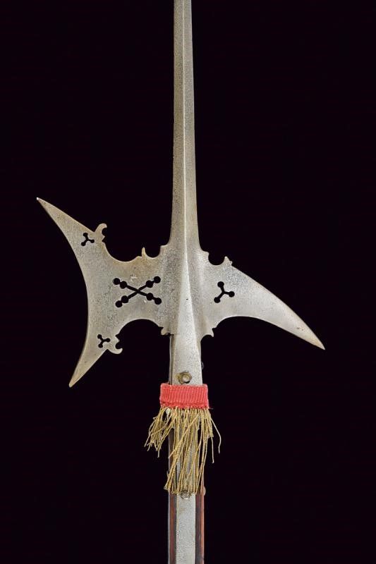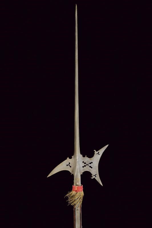 Prima metà del XVII Secolo Robusta e lunga cuspide di sezione a losanga, scure e becco traforati e con gobbe. Quattro lunghe bandelle piatte. Su asta antica di sezione rettangolare.