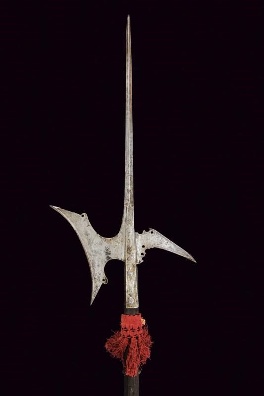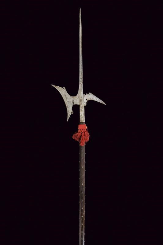 Italia, lunghezza 228 cm. 1600 circa Lunga cuspide di sezione romboidale, scure con taglio concavo e due gobbe traforate, penna obliqua con punta rinforzata e base intagliata e traforata. Resti di bandelle su fusto ligneo di sezione ottagonale riccamente decorato con rivetti, nappa moderna.