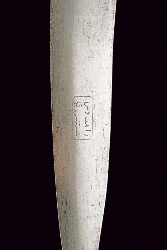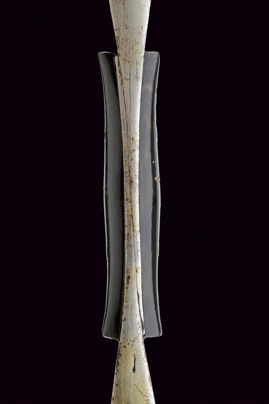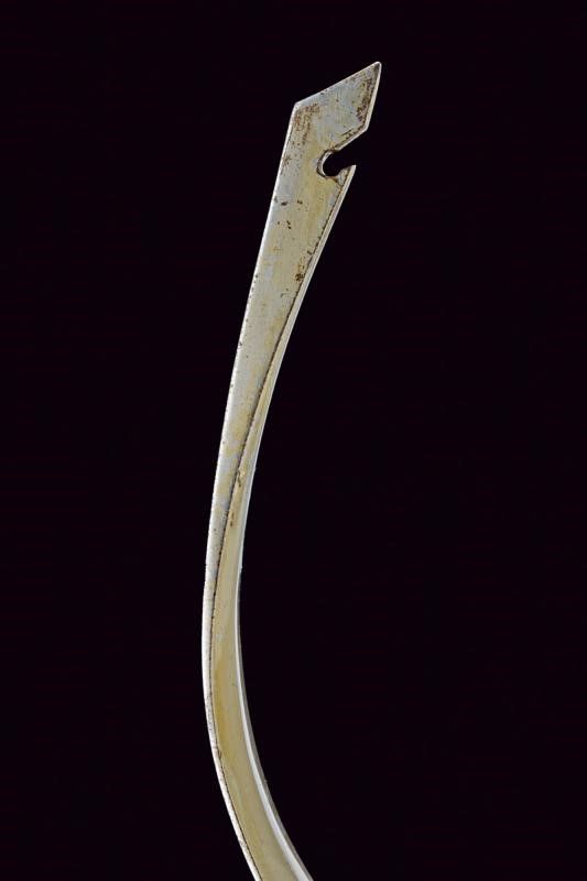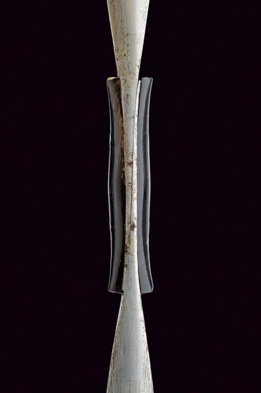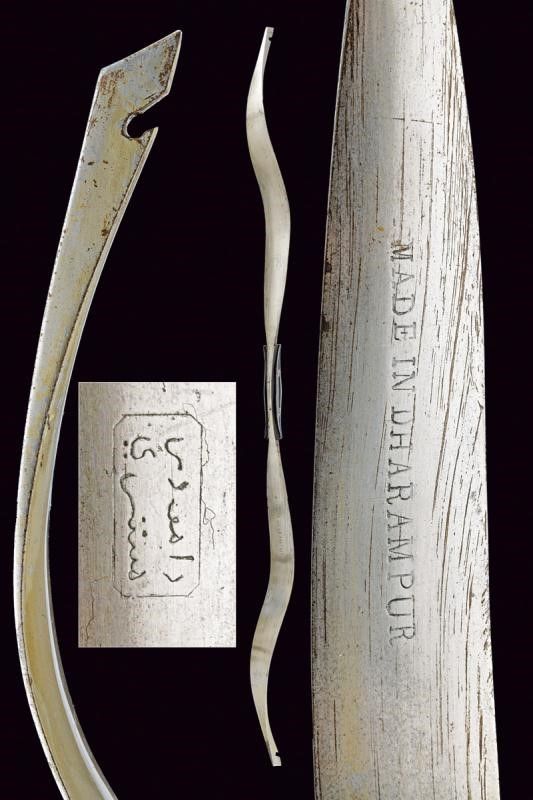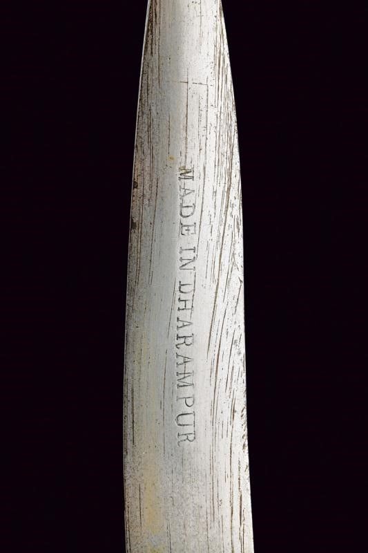 XX Sec. In ferro, realizzato in due metà unite al centro; due guancette in corno con rivetti in ferro; su un lato marcatura 'MADE IN DHARAMPUR' e con cartiglio recante iscrizioni in lingua indiana.