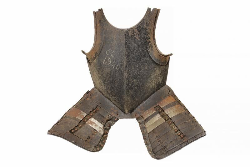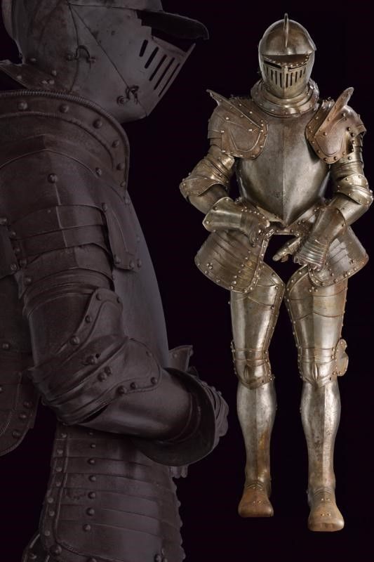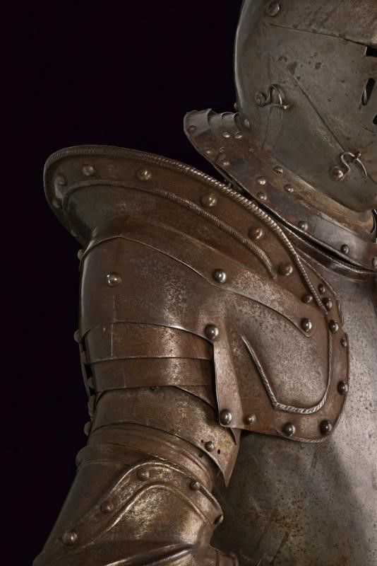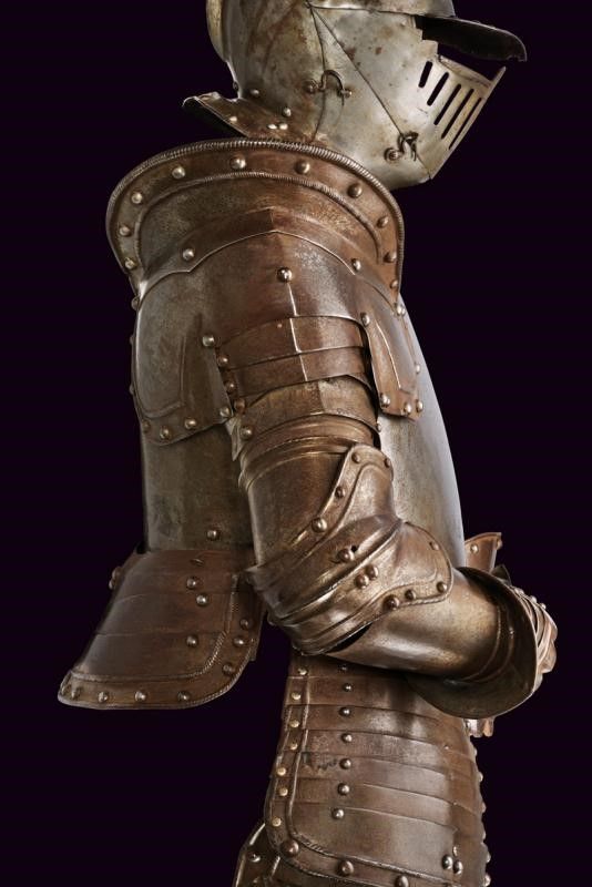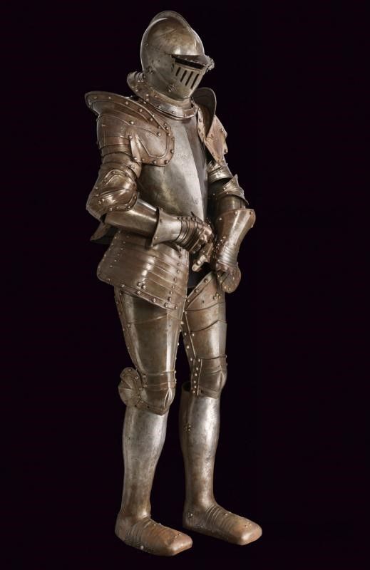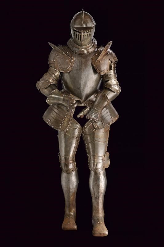Olanda, altezza 174 cm. XVII Secolo Composta da elmo da corazza con ventaglia a gabbia, petto costolato, schiena, spallacci con guardagoletta, completi bracci e manopole, scarselle, gambali completi. Restauri e mancanze; qualche integrazione ottocentesca (schinieri). Manichino non incluso.