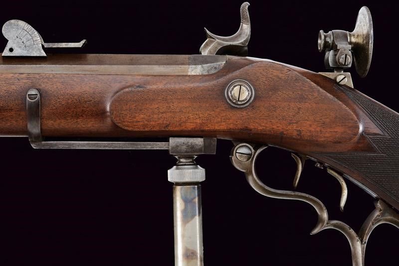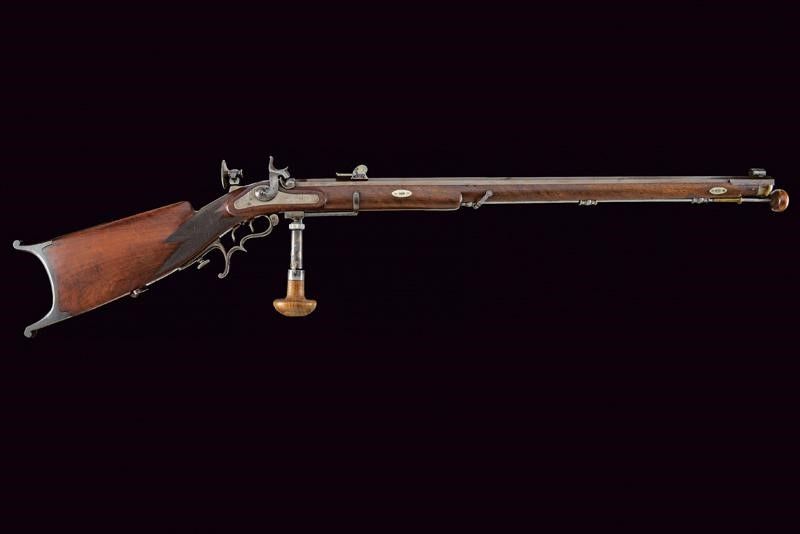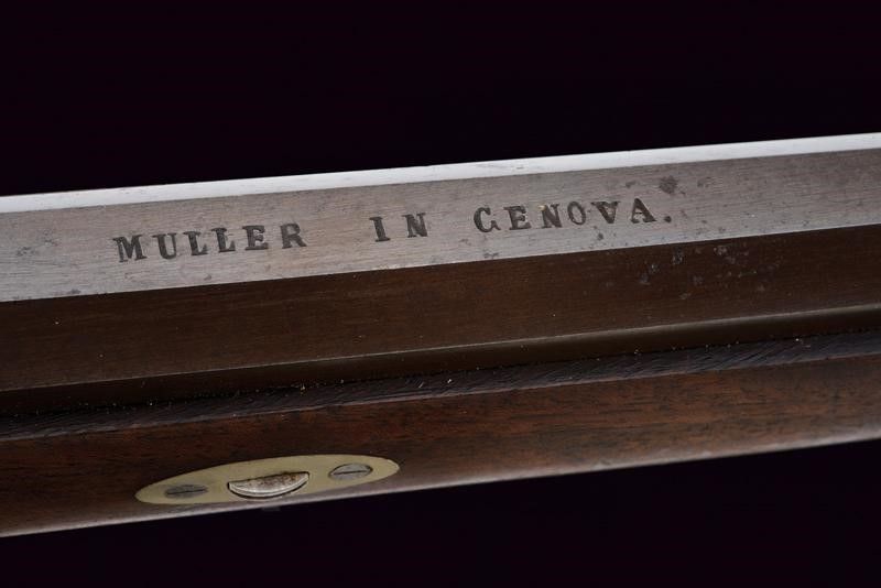 Genova, lunghezza 123 cm. Metà del XIX Secolo Canna rigata ottagonale, con culatta numerata '278', firmata 'MULLER IN GENOVA', dotata di alzo regolabile e mirino di precisione, cal. 8 mm. Codetta munita di diottra, batteria a molla in avanti con cartella piatta. Cassa intera in legno con collo zigrinato. Fornimenti in ferro con ponticello anatomico. Stecher (da aggiustare). Meccanica funzionate. Davanti al ponticello un pomo di presa con posizione regolabile. Bacchetta in ferro con impugnatura in legno.